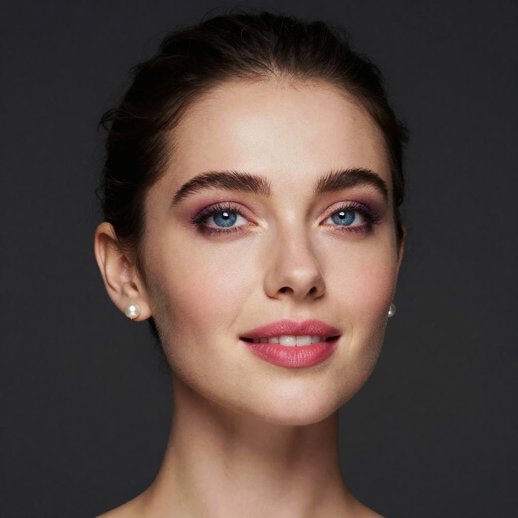 Photograph of a young Caucasian woman with fair skin and bright blue eyes, set against a dark, solid background. She has dark brown hair pulled back, subtle natural makeup with pink eyeshadow, dark eyebrows, and red lipstick. She wears small pearl stud earrings. Her expression is neutral with a slight, closed-mouth smile. The lighting highlights her face, giving it a soft, glowing appearance. The image is a close-up, focusing on her face and upper shoulders.