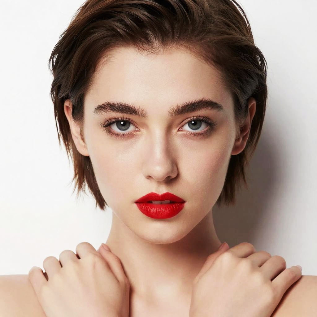 Photograph of a fair-skinned woman with blue eyes, dark brown hair, red lipstick, subtle makeup, and pearl earrings, against a dark background