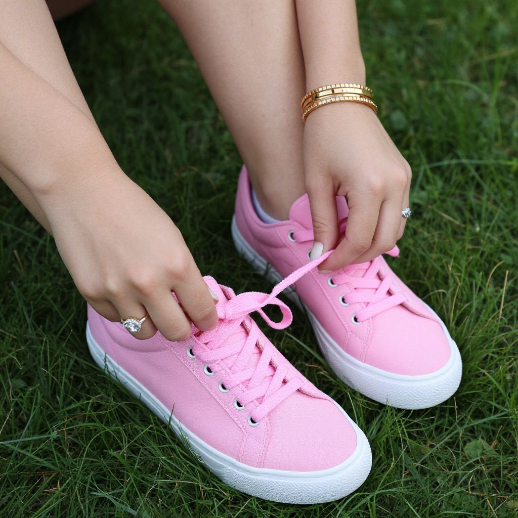Woman's hands tie vibrant pink sneakers' laces while showcasing a sparkling diamond ring and gold bracelets, set against a lush green grass backdrop.