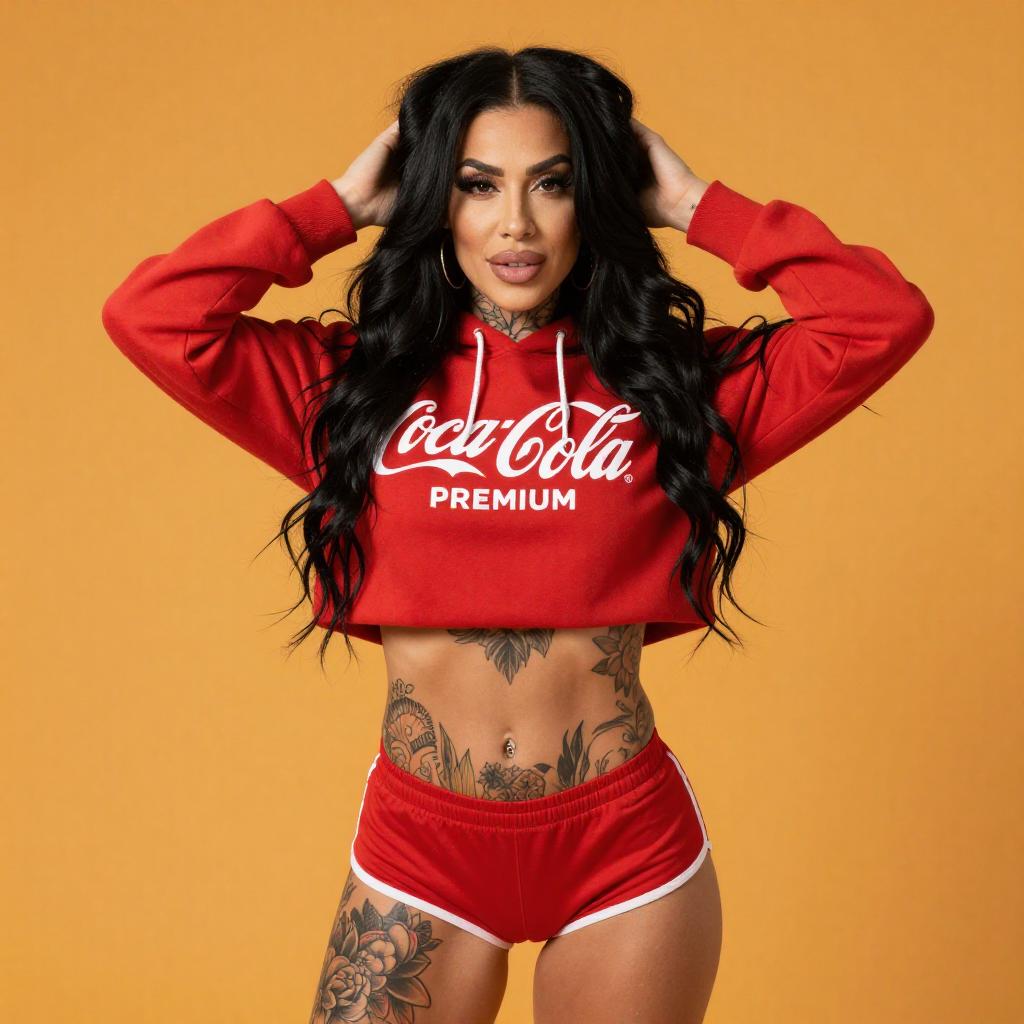 Photograph of a tattooed woman with long black hair, wearing a red cropped hoodie with "Coca-Cola Premium" in white, and red shorts. She poses against a bright orange background, hands in her hair, showcasing detailed tattoos on her midriff and thighs. Her expression is confident, with a slight smile.
