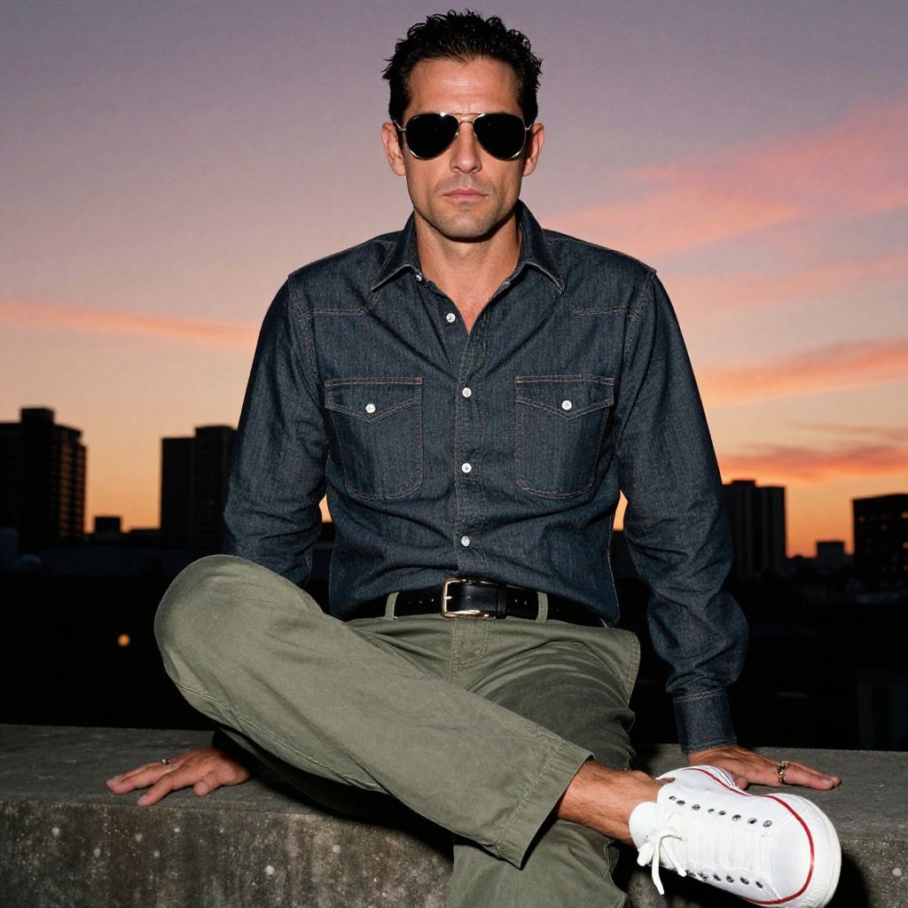 A man, olive green quilted field jacket, charcoal henley shirt, light wash straight-leg jeans, brown suede desert boots, casual leather belt, sunset glow, flag fluttering, ancient stone archways, Cibachrome style, relaxed expression Man has masculine face and piercing eyes