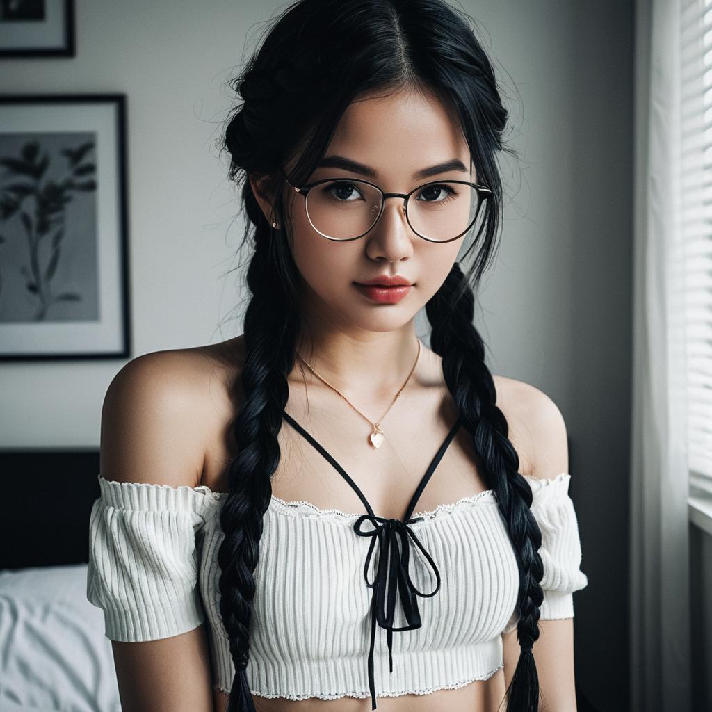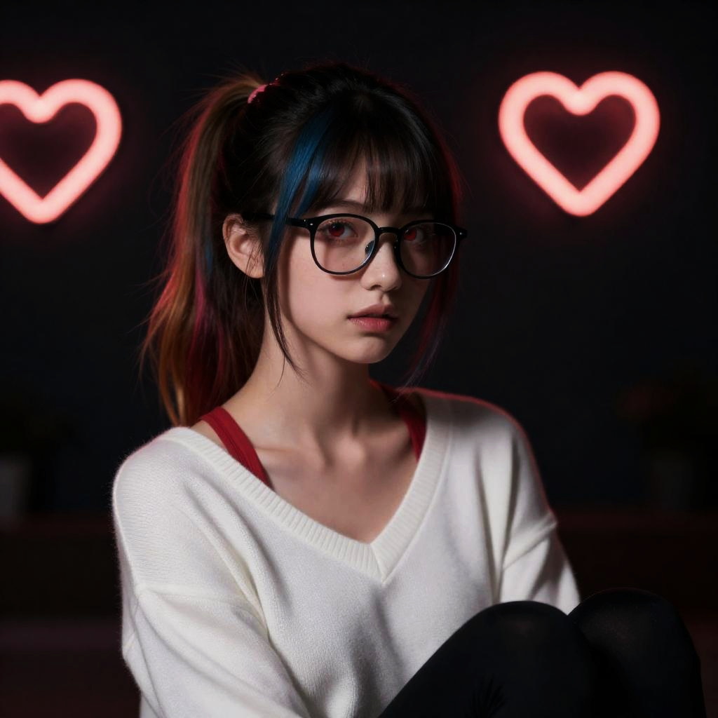Woman, wearing glasses, lights bokeh background, multi-color hair ponytail, swept bangs, white sweater, red undershirt, black yoga pants, elegant, beautiful, freckles, realistic, heterochromia, beautiful red eyes, up close, dark shadows, night background, neon hearts lights dark, chiaroscuro, low-key
