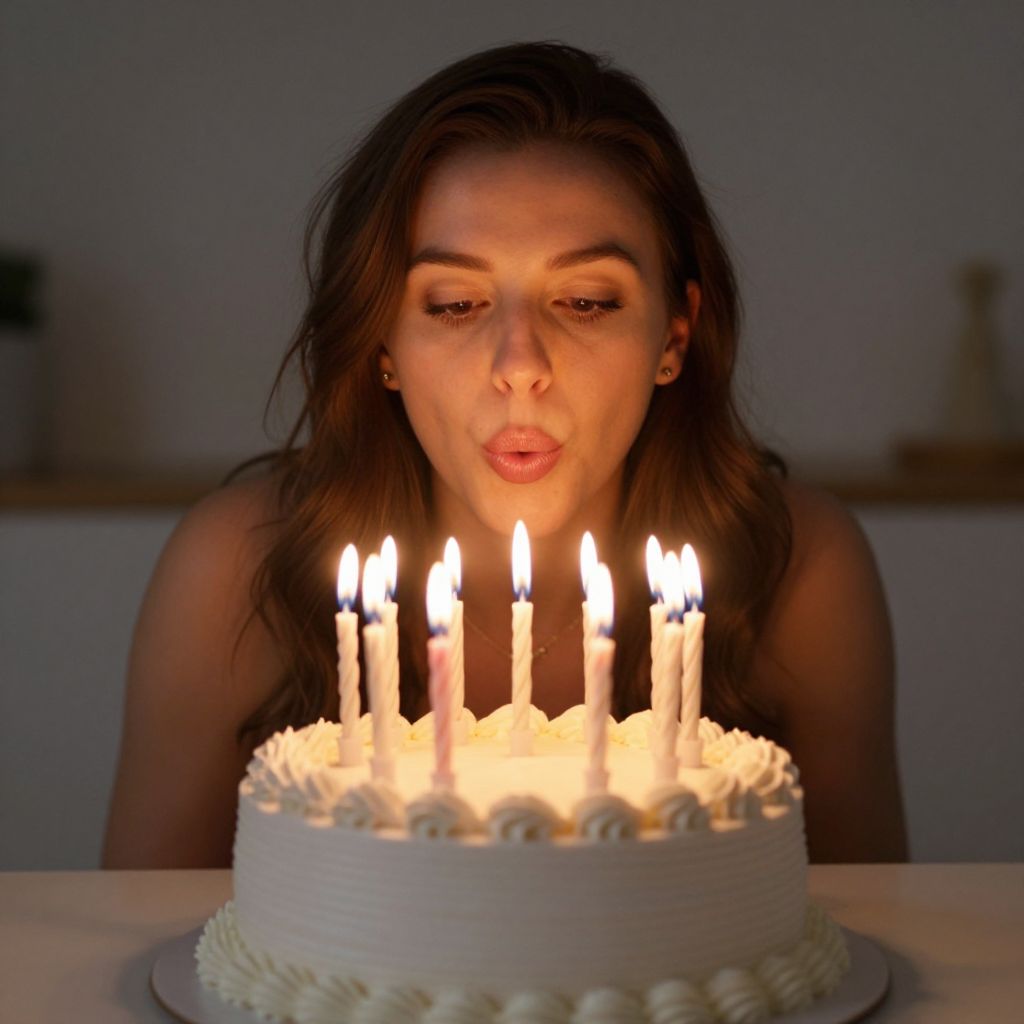 Photograph of a young woman with long brown hair and fair skin, gazing intently at a white frosted birthday cake with seven lit candles in front of her. She is making a pouty, blowing-out expression. The cake has intricate white icing patterns and is centered on a table with a blurred, dark background. The candle flames cast a warm glow on her face, highlighting her focused expression. She is wearing a simple, sleeveless top, and the overall ambiance is intimate and celebratory.