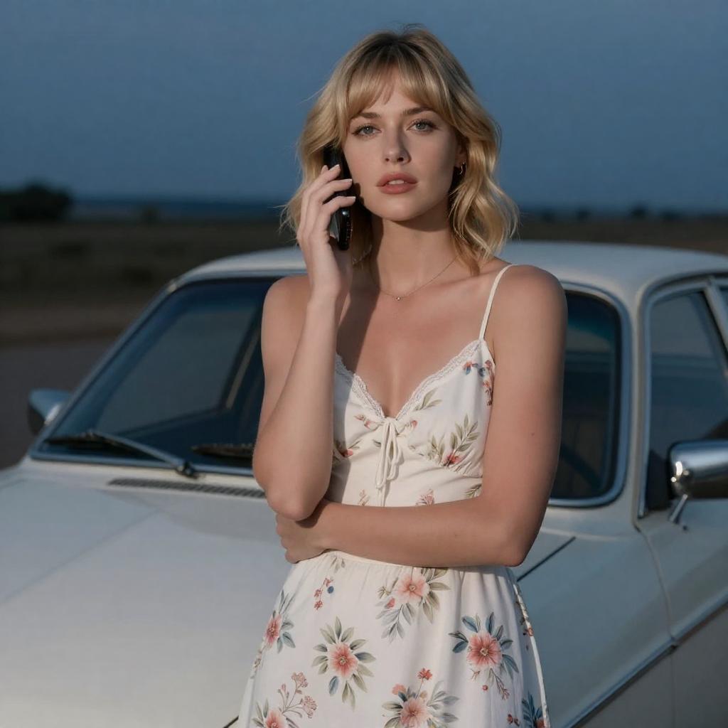 Photograph of a blonde woman with an elegant updo, wearing a strapless black dress with a red floral pattern, and a silver necklace. She stands against a nighttime cityscape, holding a phone to her ear with her right hand, her left hand on her hip. The background features blurred city lights.