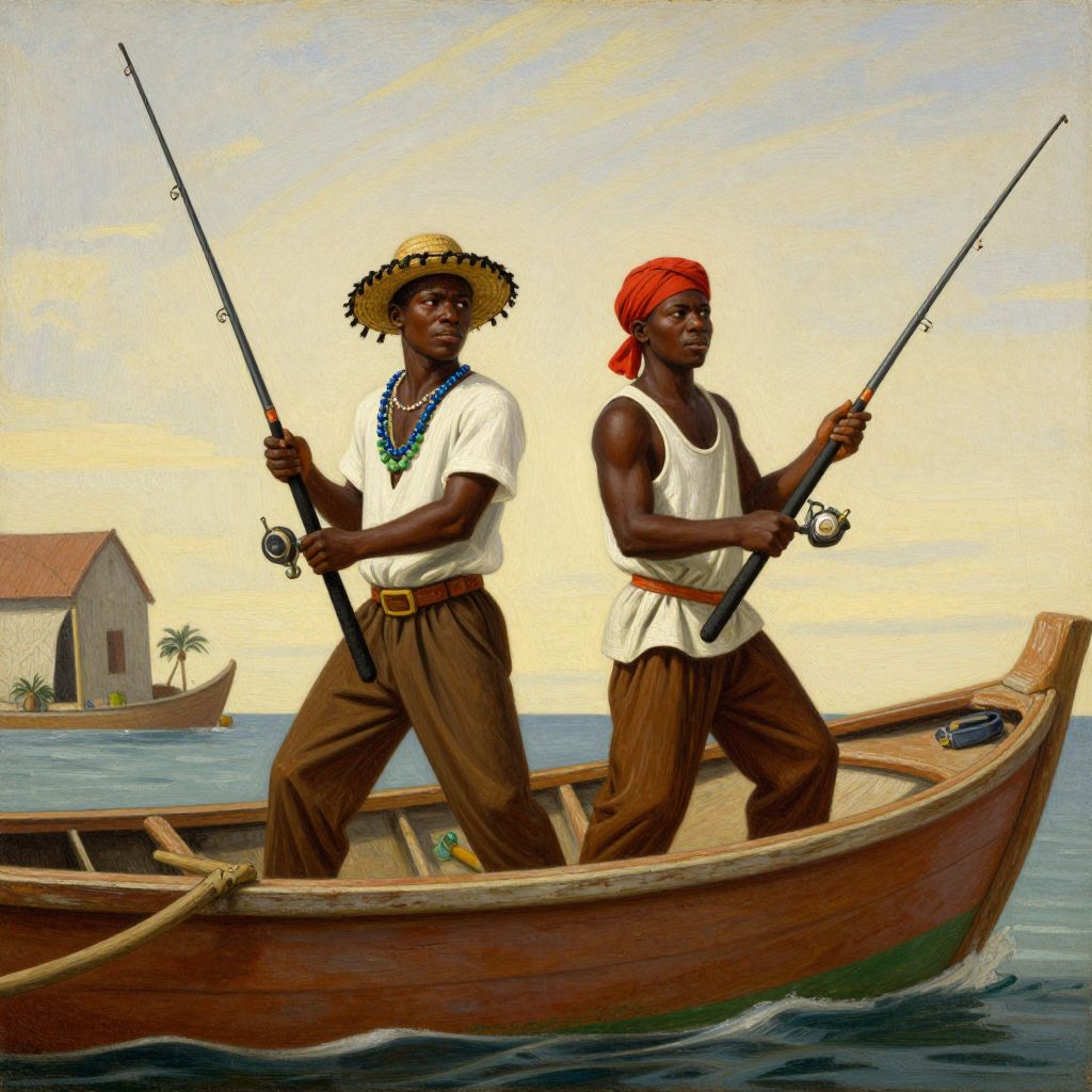 In this highly detailed and realistic painting, two young Martinican fishermen are depicted on a large boat, each holding a fishing rod. The man on the left, with dark brown skin, wears a straw hat adorned with black tassels, a white shirt, and brown pants, accessorized with a blue and green necklace and a brown belt. The man on the right, also with dark brown skin, sports a red turban, a white tank top, and brown pants. Both are positioned dynamically, with their fishing rods angled towards the viewer, suggesting readiness and engagement in their craft. The boat, painted in shades of brown and green, occupies the lower portion of the image, providing a sense of depth and perspective. The overall composition is balanced, with the fishermen's figures centrally positioned, creating a focal point that draws the viewer's eye. The scene is set in a medieval-like environment, characterized by the fishermen's attire and the rustic, yet detailed, depiction of their surroundings. The interplay of colors, textures, and shapes enhances the realism and authenticity of the painting, capturing the essence of a moment in the lives of these skilled fishermen.