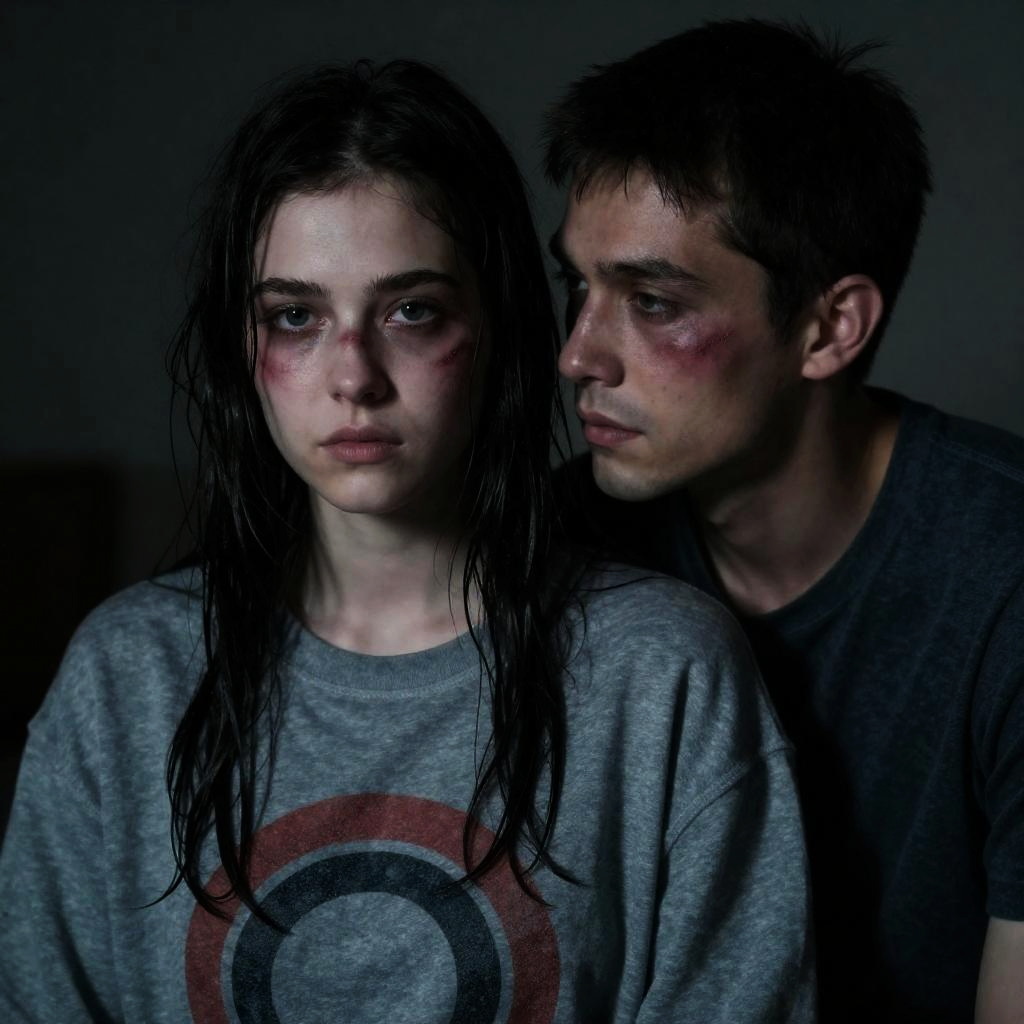 Photograph of two people in dim lighting. Woman with wet, dark hair, pale skin, and bruised face wears gray sweatshirt with red and black circular design. Man with short dark hair, light skin, and bruised face leans close to her. Woman's intense gaze, man's sideways glance. Background is dark, indistinct.