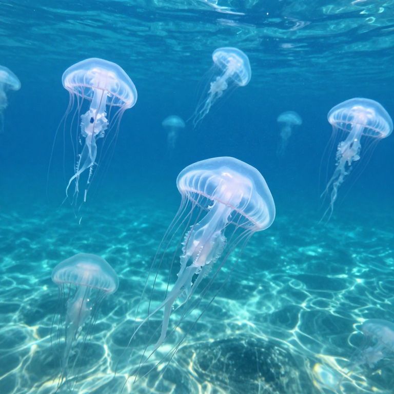 A mesmerizing expanse of translucent, jellyfish-like structures drift serenely across a shallow, luminescent ocean, their ethereal forms pulsating with radiant light that mirrors the rhythmic pulse of the sea below.