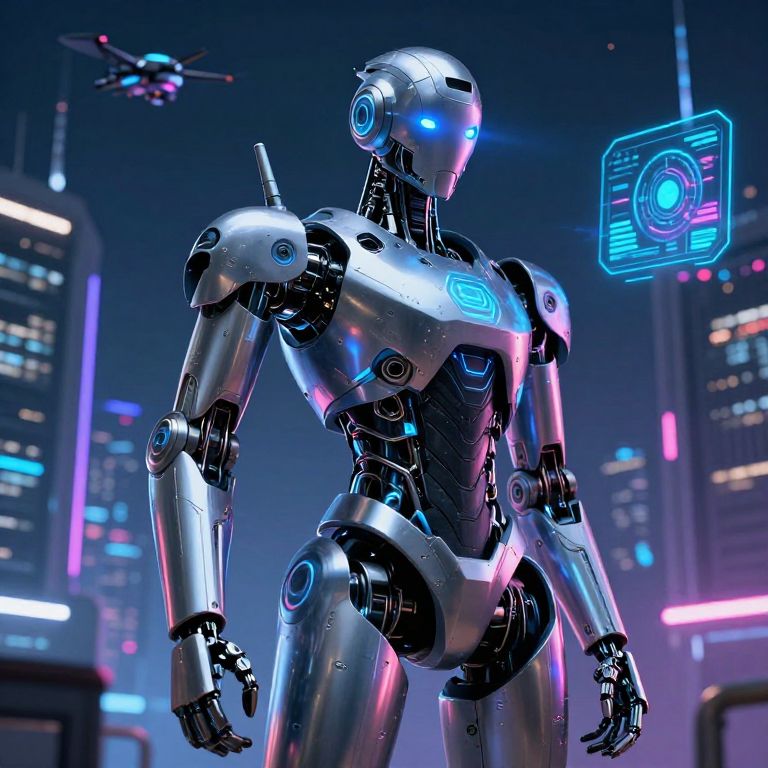 Robor, a futuristic humanoid robot with sleek metallic armor, glowing blue eyes, standing in a neon-lit cyberpunk cityscape at night, surrounded by holographic interfaces and flying drones, detailed concept art style.