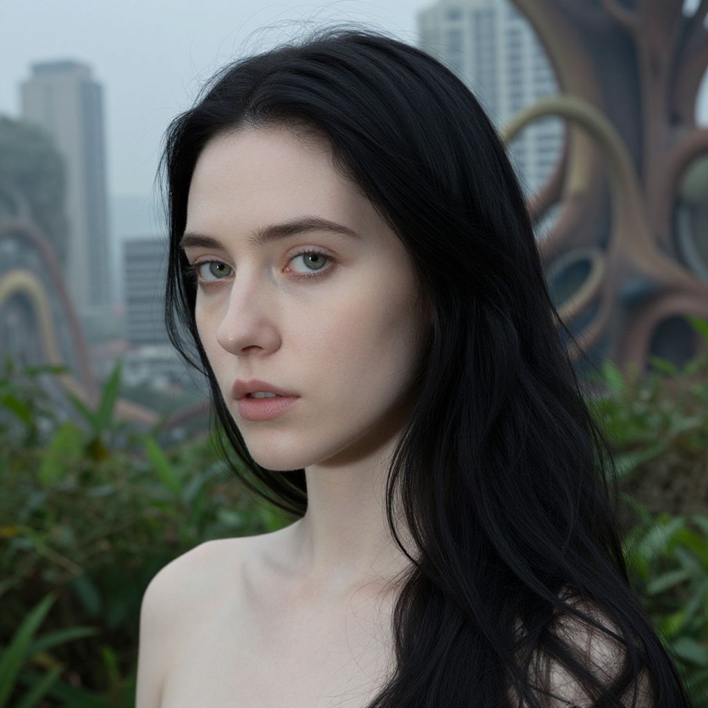 Photograph of a young woman with pale skin and long, straight black hair, standing outdoors. She has blue eyes, a small nose, and full lips. Her expression is neutral, with a slight gaze to her left. She is topless, with her shoulders visible. The background features a blurred cityscape with tall buildings and a large, twisted tree-like structure. The greenery in the foreground contrasts with the urban setting. The lighting is natural, with an overcast sky adding a soft, diffused light to the scene. The image has a realistic, high-definition style.