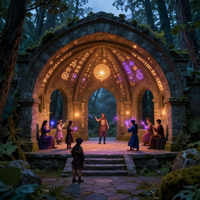 Photograph-style digital art of a mystical forest archway illuminated with glowing runes, surrounded by cloaked wizards and a young child holding a candle, under