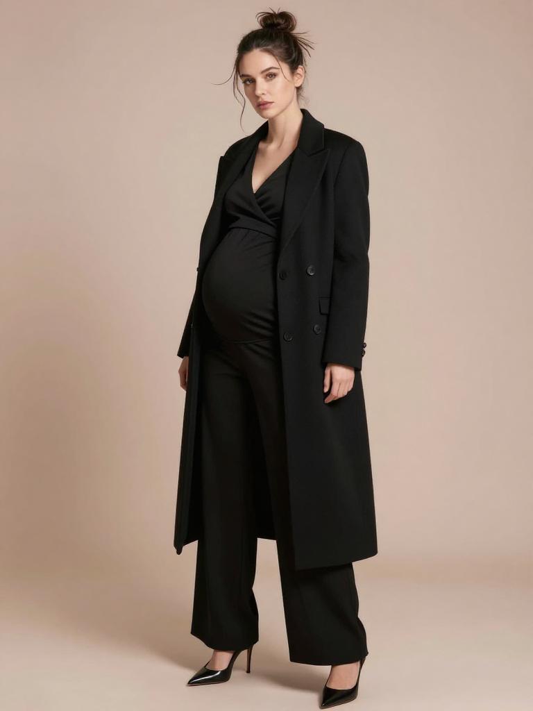 Stylish pregnant woman with a pronounced baby bump wearing a sleek monochrome black outfit. The ensemble features a black wrap-front top emphasizing the belly, longline black wool coat with clean lapels, flowy black palazzo trousers, and black stiletto heels. She has a messy topknot hairstyle with loose strands, standing against a soft blush-toned studio background with flattering soft lighting. High-end maternity fashion photography capturing elegance and modern pregnancy style.