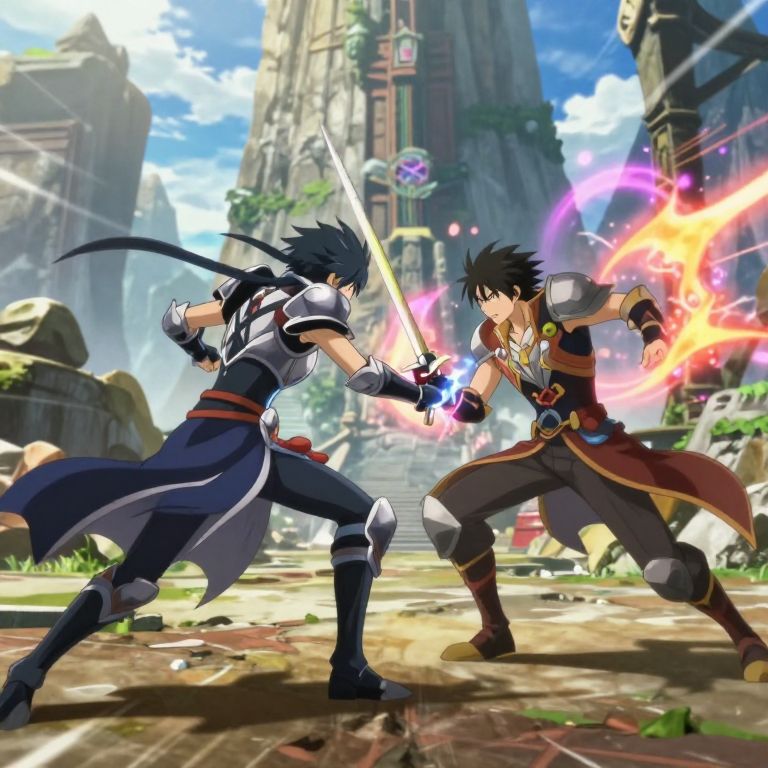 Anime upscale scene featuring a dynamic battle between two characters in a fantasy world, high detail on armor and weapons, intense motion blur effects, colorful magical aura, detailed environment with towering ancient ruins, cinematic lighting