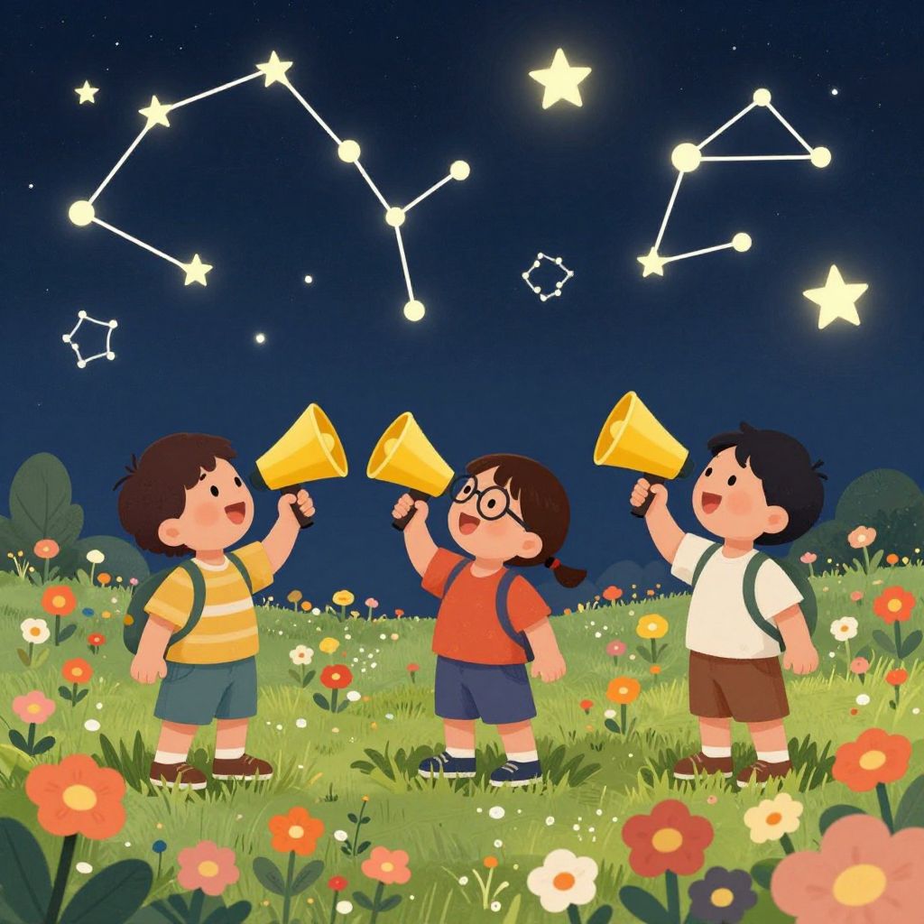 In a whimsical cartoon-style illustration, three children stand in a field of vibrant flowers, each holding a yellow megaphone as if shouting at the night sky, where geometric constellations and stars inspire the blooming shapes of the flowers below, creating a magical and imaginative scene.