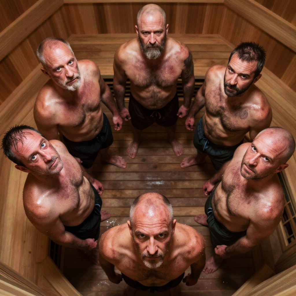 Fractals worms-eye angle, on the floor looking up at five men standing in a circle looking down at the camera, long hair, smooth skin, flirty, sauna, sweat, by Ron Griswold
