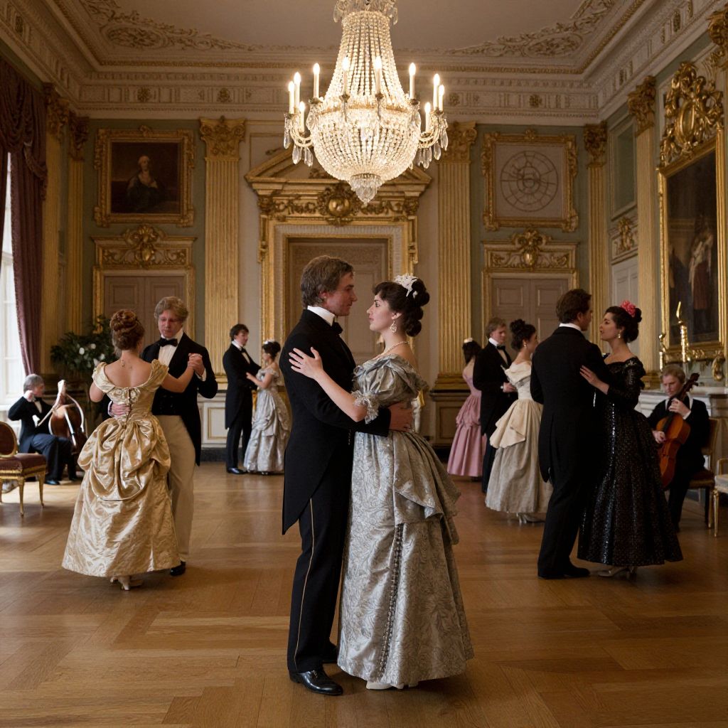 1830s ballroom scene inside grand historic mansion, elegant men and women in formal period costumes dancing, crystal chandeliers illuminating ornate decor, classical musical instruments, rich textures in fabrics and woodwork, capturing refined social life of early 19th century
