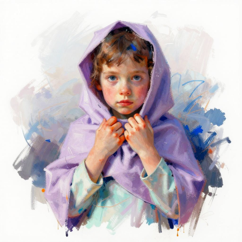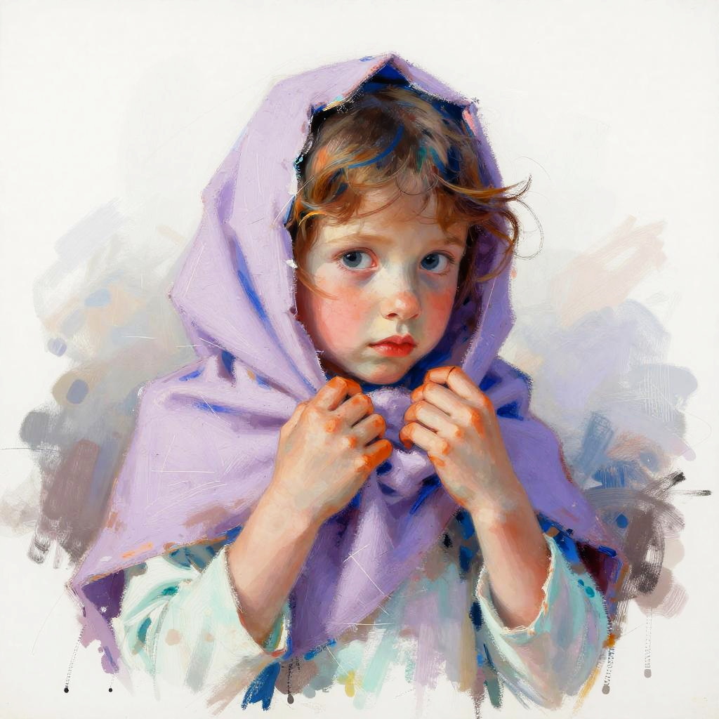 Expressionist semi-abstract portrait of disjointed child wrapped in lavender and mint attire with segmented ochre fingers, rendered in symbolist pastel work featuring soft smudges and layered scratch marks, high-contrast bold colors, loose gestural strokes and textured paint ridges, minimal white negative space with asymmetrical crop, cobalt-shadow accents and suggestive contours, emotive gentle nostalgia mixed with tentative curiosity, contemporary art poster vibe, painterly chaos with subtle drips, unresolved edges, luminous highlights.