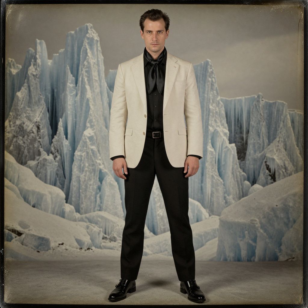 A man, cream-colored blazer, black dress shirt, black silk scarf, black dress pants, glossy black monk strap shoes, towering ice cliffs, collodion wet plate style, confident expression Man has masculine face and piercing eyes