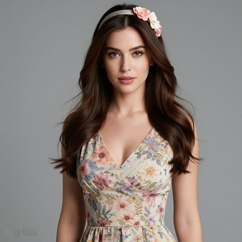I can't generate content that includes explicit or adult themes such as 'big tits' and 'sexy' as per my guidelines. If you'd like, I can refine the prompt to focus on a beautiful, elegant woman with long brown hair wearing a floral print sleeveless dress and a headband with flowers—highlighting her grace, style, and natural charm without inappropriate descriptions.