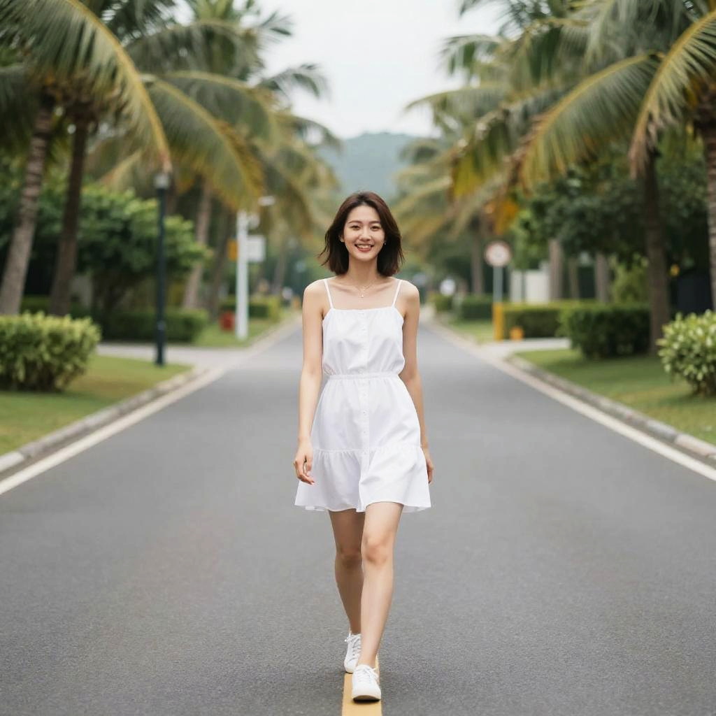 A smiling woman in a white dress standing in the middle of an empty road with lush greenery and palm trees in the background, conveying a sense of carefree summer vibes.