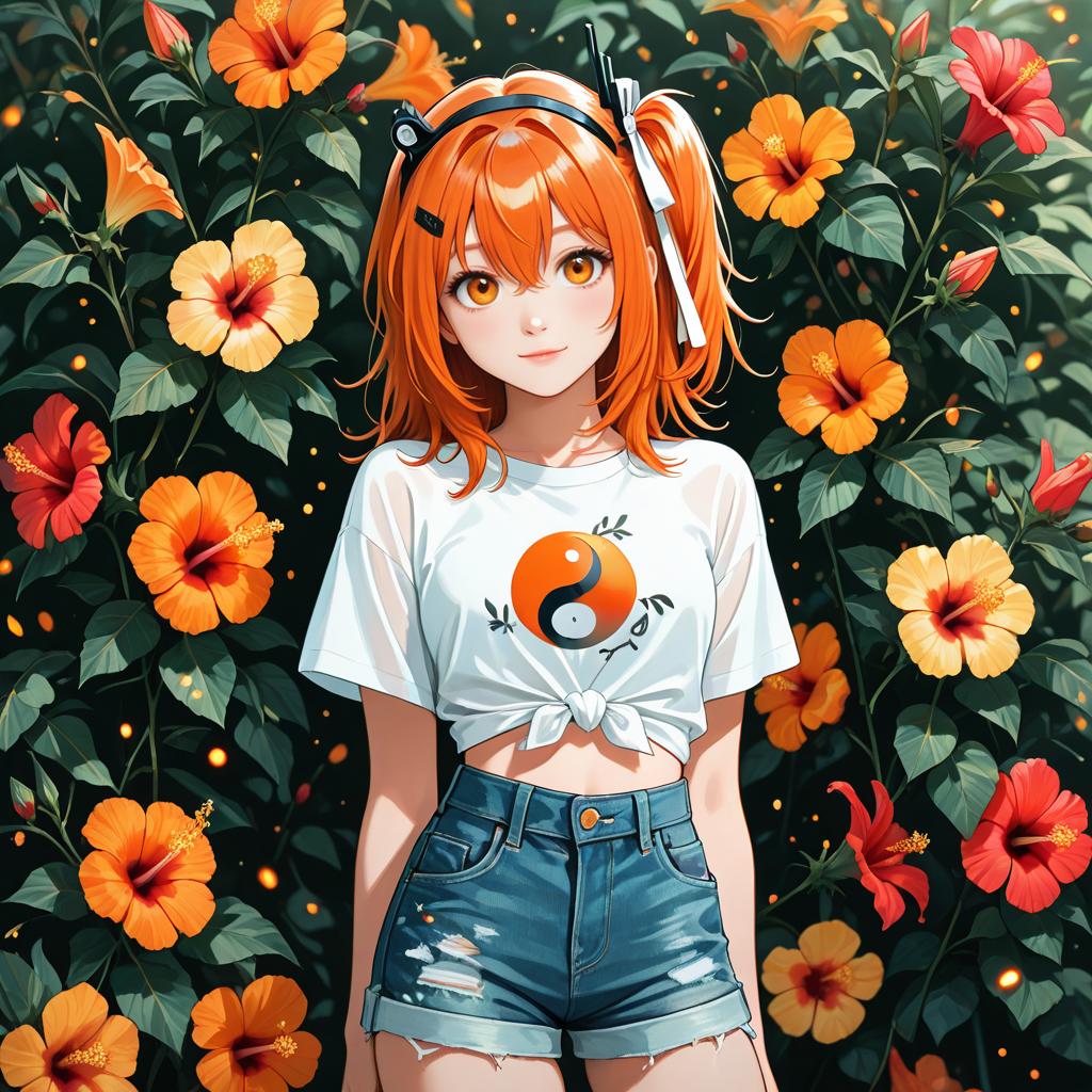 Illustration of an anime-style girl with orange hair wearing a white tied-up crop top and blue denim shorts. She is standing against a backdrop filled with vibrant red, orange, and yellow hibiscus flowers and green leaves. The girl has bright amber eyes and wears a black and white headband with a bow.