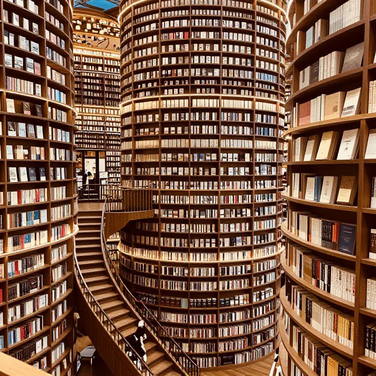 This vibrant digital illustration depicts a towering, spiral library with cylindrical bookshelves extending up and around in a circular pattern. The shelves are densely packed with books of varying sizes and colors, creating a rich, textured backdrop. A spiral staircase, centrally located, winds upward through the shelves. The image is brightly lit with warm, natural light streaming in from the top, casting shadows that add depth. The perspective emphasizes the vastness and complexity of the library. The style is highly detailed and slightly surreal, with bold colors and sharp contrasts enhancing the dramatic effect.