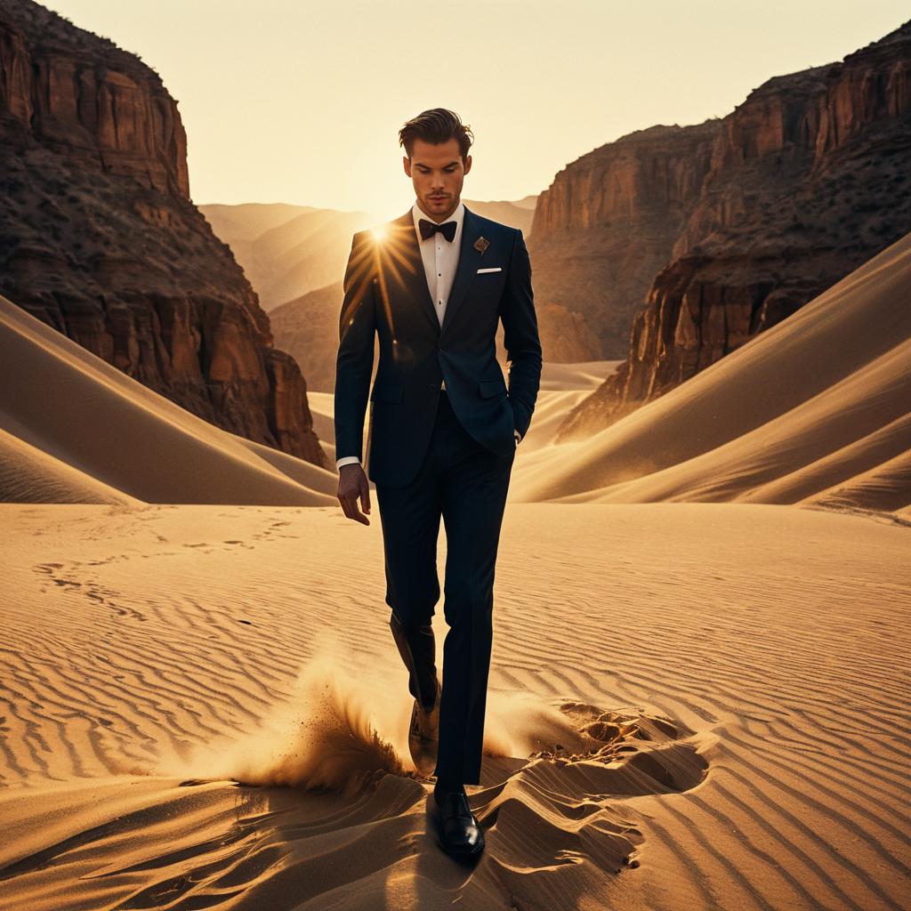 Dramatic high-fashion editorial set in sunlit desert canyon at golden hour, showcasing a confident male model in sharp tailored suit, enveloped by swirling grains of sand and warm twilight haze, rendered as an intricate oil painting with multiple exposure, Vogue cover style, cinematic lighting by Stanley Kubrick and Greg Rutkowski.