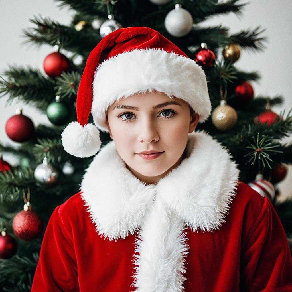 Christmas eve outfit,1girl, christmas tree, solo, hat, christmas, santa hat, short hair, sweater, blurry, realistic, brown hair, looking at viewer, blurry background, brown eyes, standing, belt, christmas ornaments, long sleeves, red sweater