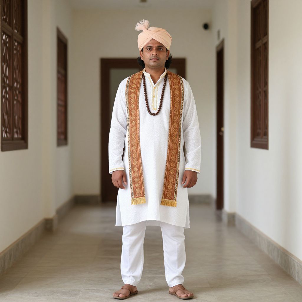 Photograph of a South Asian man standing in a long, narrow corridor with white walls and marble flooring. He wears a white traditional kurta and pants, paired with a beige turban adorned with a white feather. He also has a black bead necklace and an orange and yellow patterned scarf draped over his shoulders. His dark hair is visible beneath the turban. He stands confidently with a neutral expression, barefoot on the floor. The corridor has dark wooden framed windows on either side. The lighting is natural, highlighting the man and the corridor's clean, simple design.
