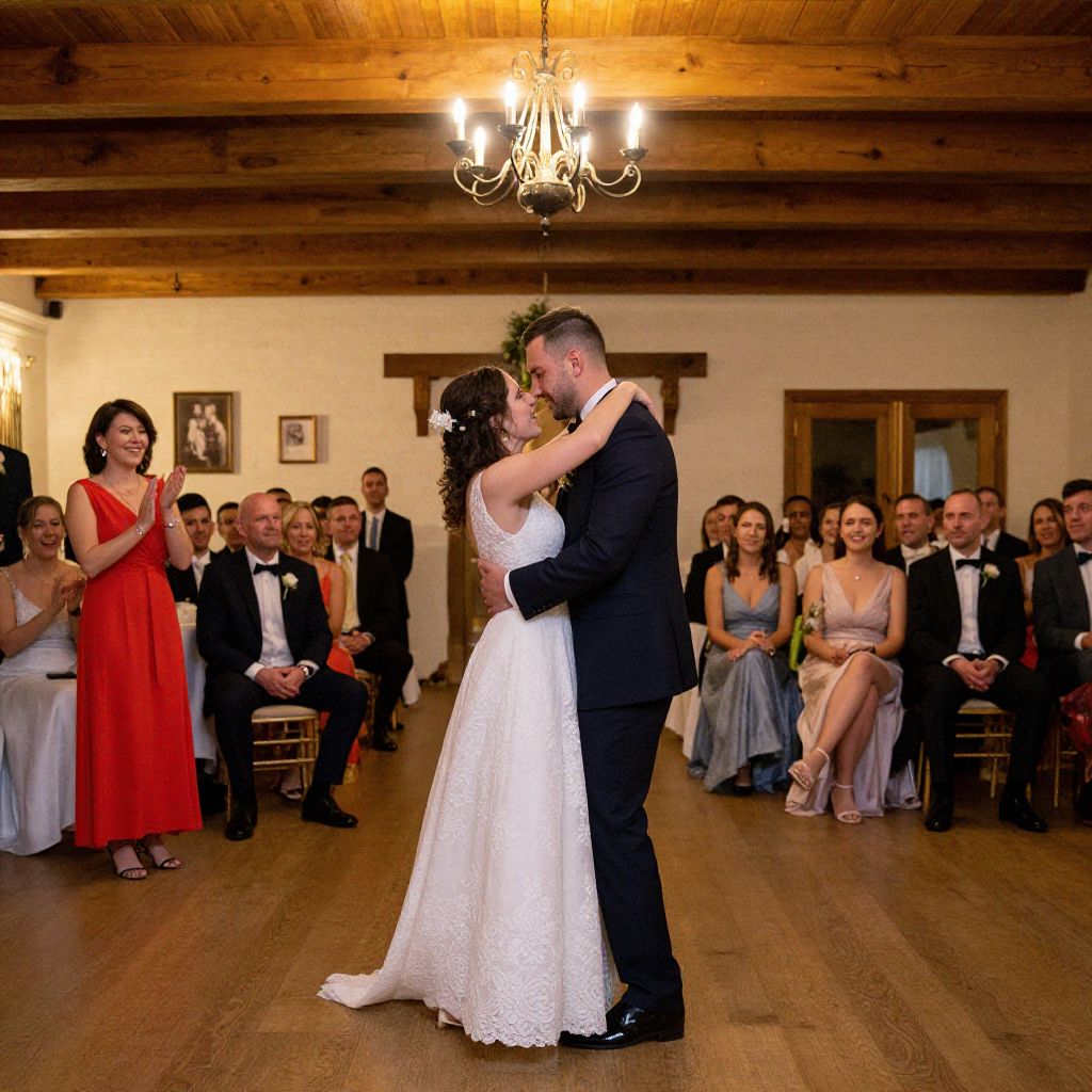 Bride and groom share their first dance in a warmly lit wooden venue, surrounded by smiling guests in formal attire, as a chandelier hangs above and a red dress-clad woman applauds to the left.