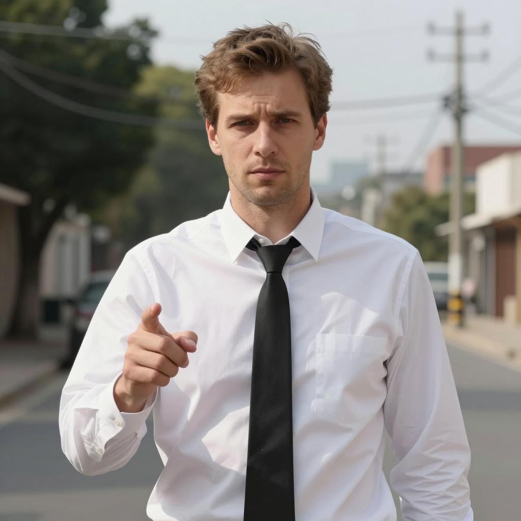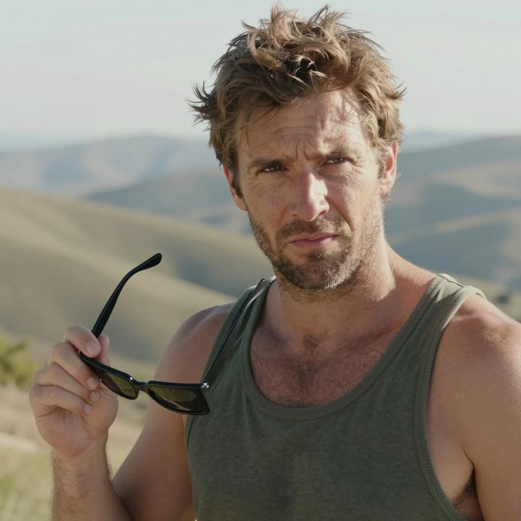 Man with shoulder-length brown hair, wearing a black tank top and beige pants, holding a trumpet in his right hand, pointing it forward. Background shows a vast, hilly landscape under a clear blue sky. Sunlight casts shadows on his arm. Bushes in the foreground. Intense expression.