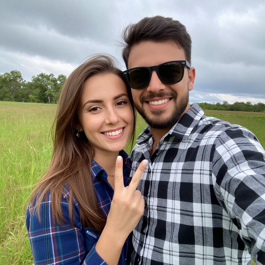 Photograph of a smiling young couple in a grassy field under a cloudy sky. The woman, with long brown hair, fair skin, and wearing a blue plaid shirt, stands close to the man. He has dark hair, a beard, and wears black sunglasses along with a black and white plaid shirt. He is making a peace sign with his right hand. The background features lush green grass and trees, creating a natural, outdoor setting. The image has a vibrant, slightly enhanced color palette, emphasizing the couple's joyful expressions and the greenery around them.
