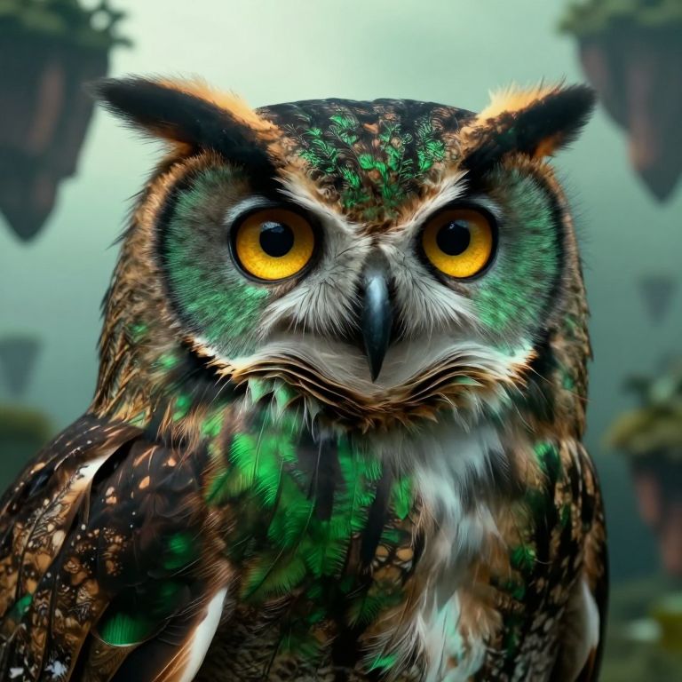 A close-up portrait of an enigmatic owl is rendered in photorealistic detail with captivating golden eyes and a sagacious expression. The bird's plumage shimmers with iridescent hues of emerald green and deep forest brown, creating an almost otherworldly aura. From a unique 'bug's-eye view' perspective, the image captures the intricate details of its feathers and delicate facial features, evoking feelings of awe and enchantment against a dreamlike backdrop of floating islands.