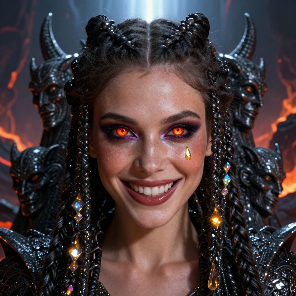 Ilya Kuvshinov style, a soul eater basking in a beam of celestial light piercing a sultry, volcanic hell-scape. Playful shadows dance across her face, highlighting a dusting of sun-kissed freckles and iridescent party makeup, with a single teardrop of molten gold tracing a path down her cheek. Her majestic braids, woven with strands of obsidian and imbued with an inner glow, cascade down her back. Incredibly detailed close-up, focus on a mischievous grin that hints at both playful cruelty and undeniable charisma. Her piercing eyes, like pools of molten ruby, radiate an otherworldly allure. Casting seat, adorned with demonic visages and crafted from obsidian, hints at her power.futuristic, scifi, intricate, elegant, majestic, Masterpiece; award winning art, award-winning glamour photograph, civitai fusion style, brilliant composition, highly detailed; extreme, octane render, zbrush, blender, 3d, post-processing, HDR; lightning; volumetric; cinematic; ray tracing; RTX;radiant light rays, subsurface scattering, soft edge lighting, realistic shadows; deep shadows, vibrant colors, high-res, 8k, 16k, 32k