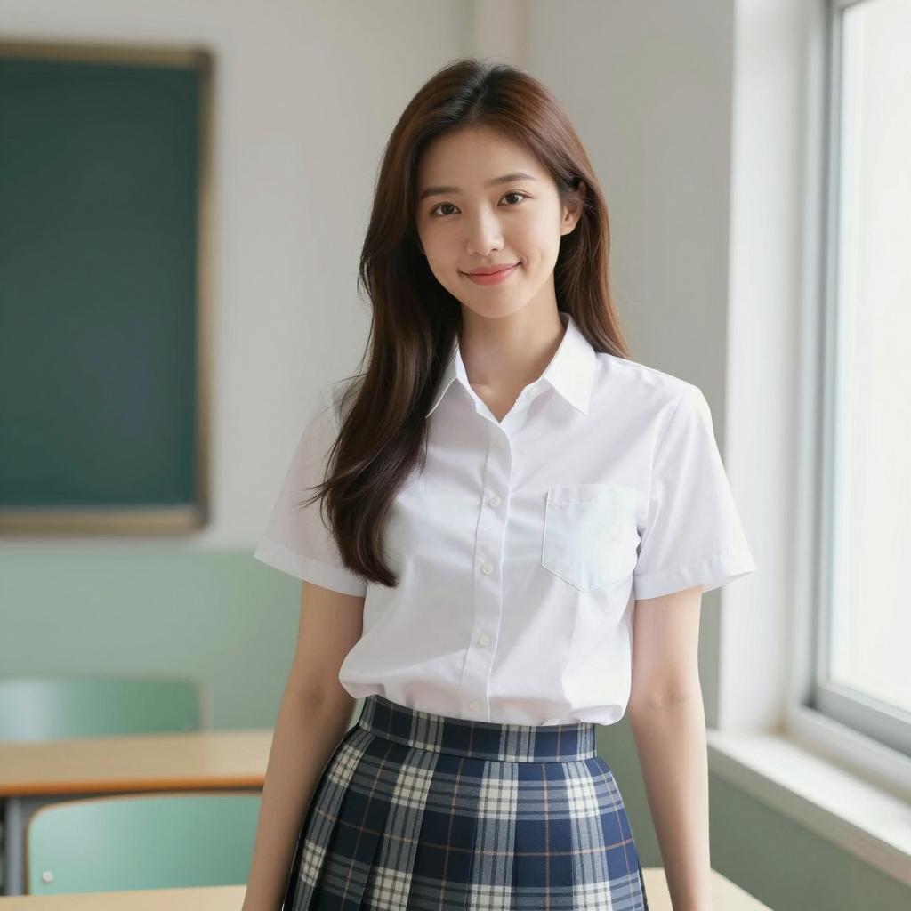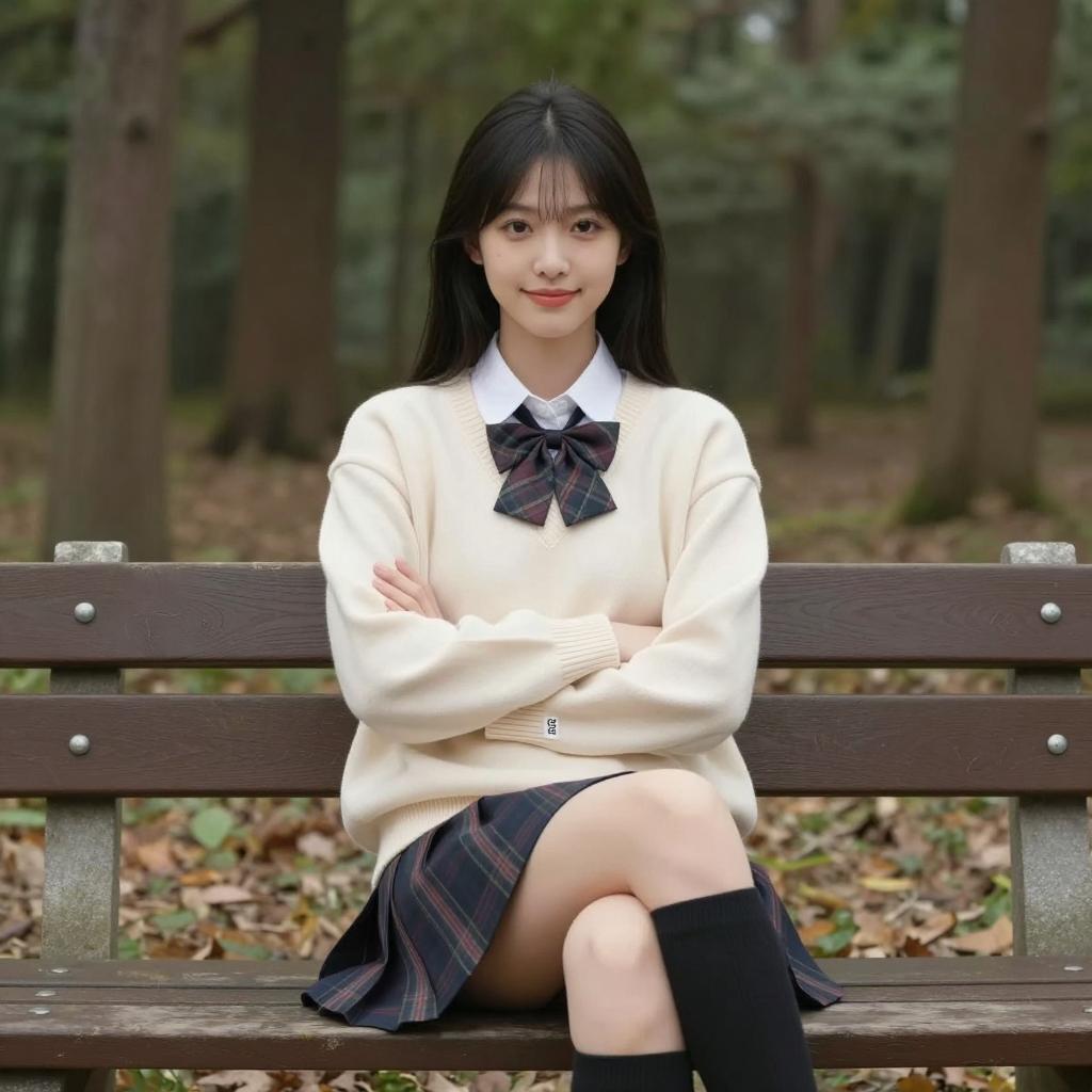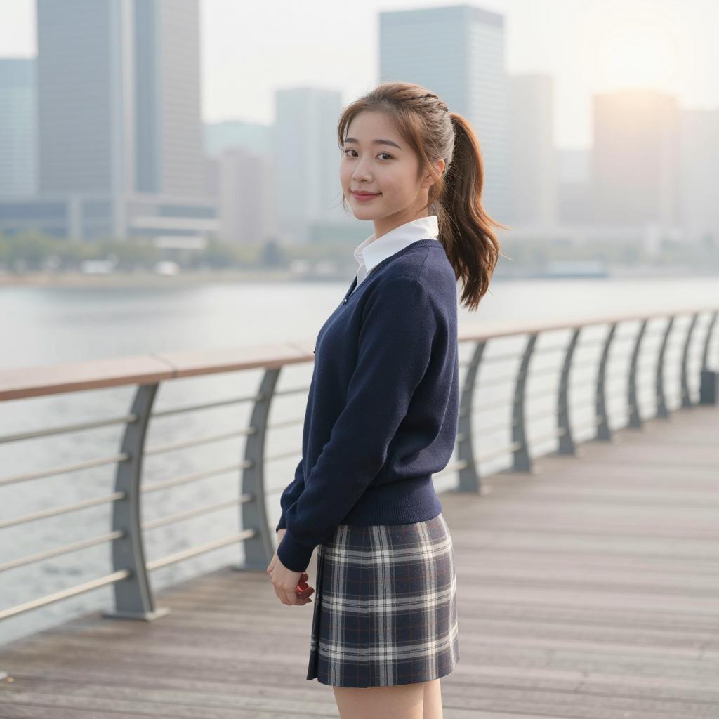Asian woman with long brown hair, wearing a dark blue sweater with white trim, white shirt, and plaid skirt, holding a blue bag. She leans slightly forward, smiling. Background: outdoor setting with palm leaves and metal railing. Daylight.