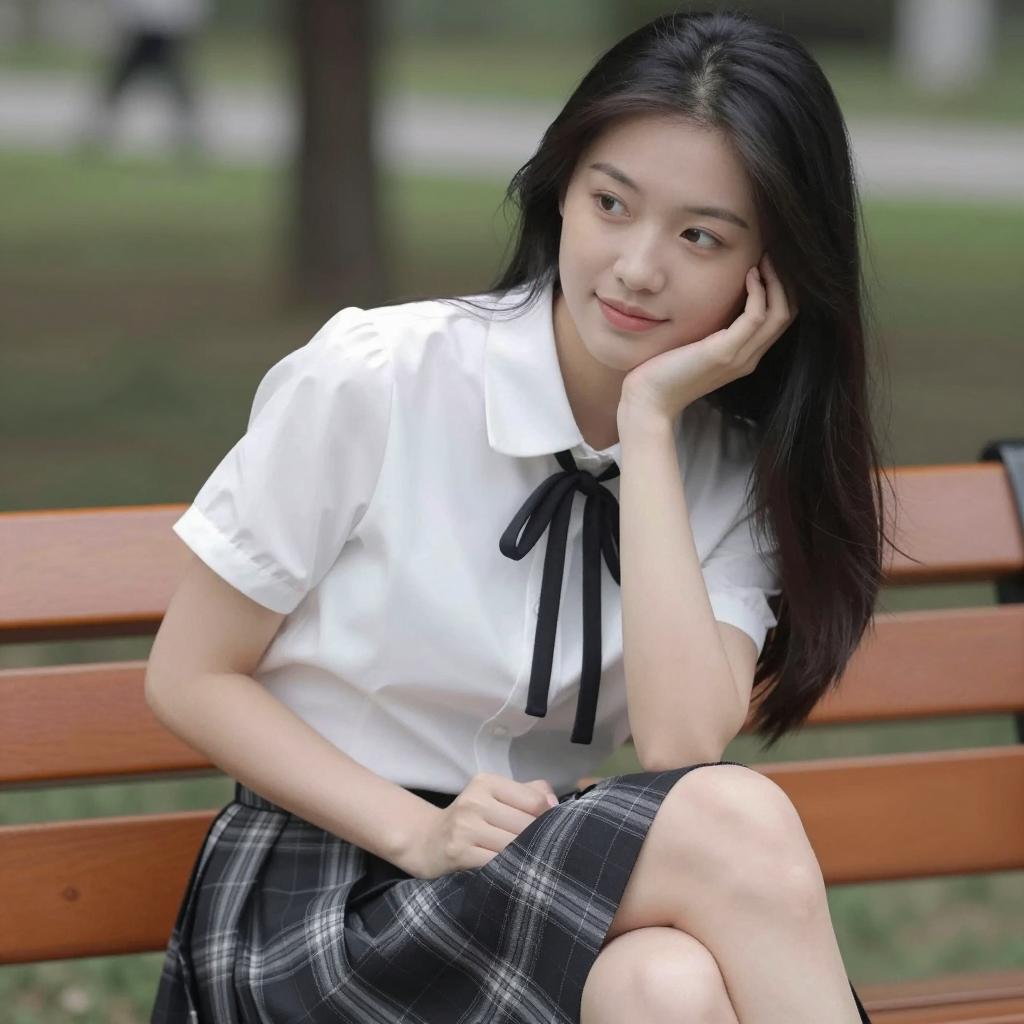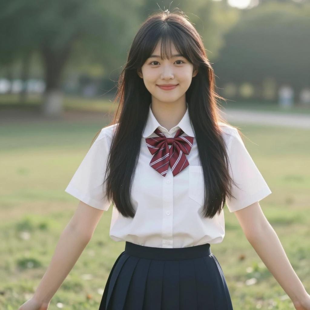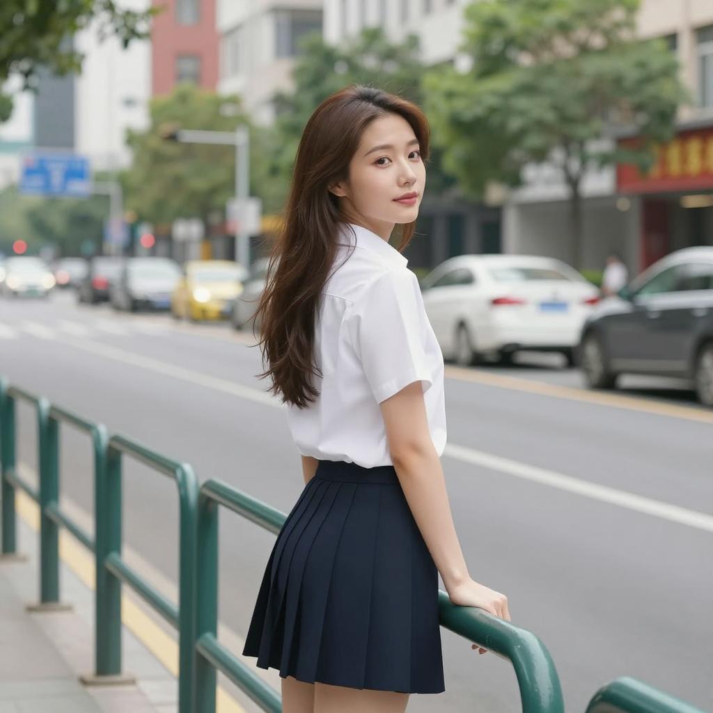 Asian woman with long brown hair, wearing a dark blue sweater with white trim, white shirt, and plaid skirt, holding a blue bag. She leans slightly forward, smiling. Background: outdoor setting with palm leaves and metal railing. Daylight.