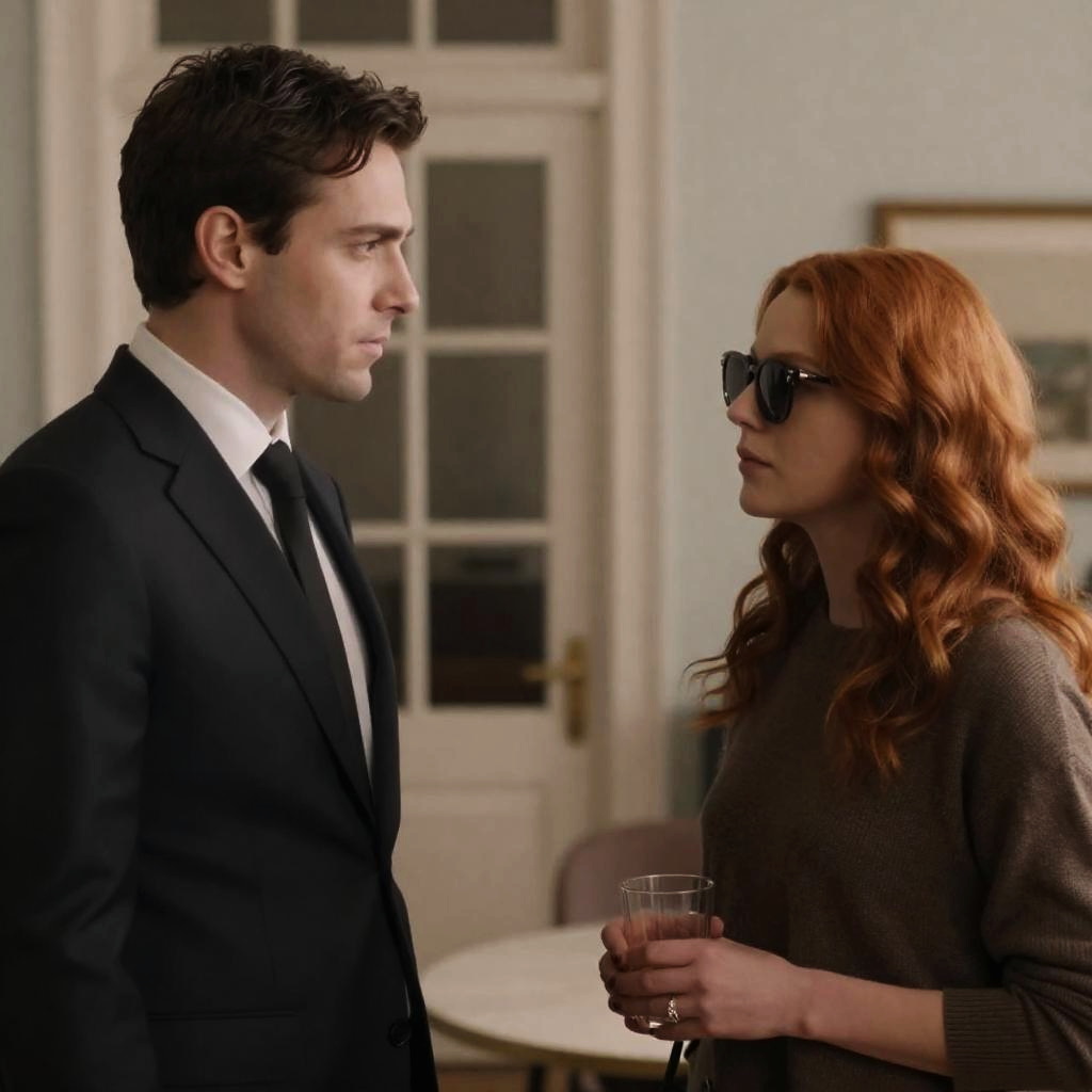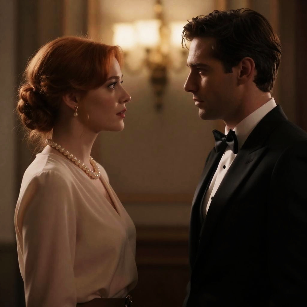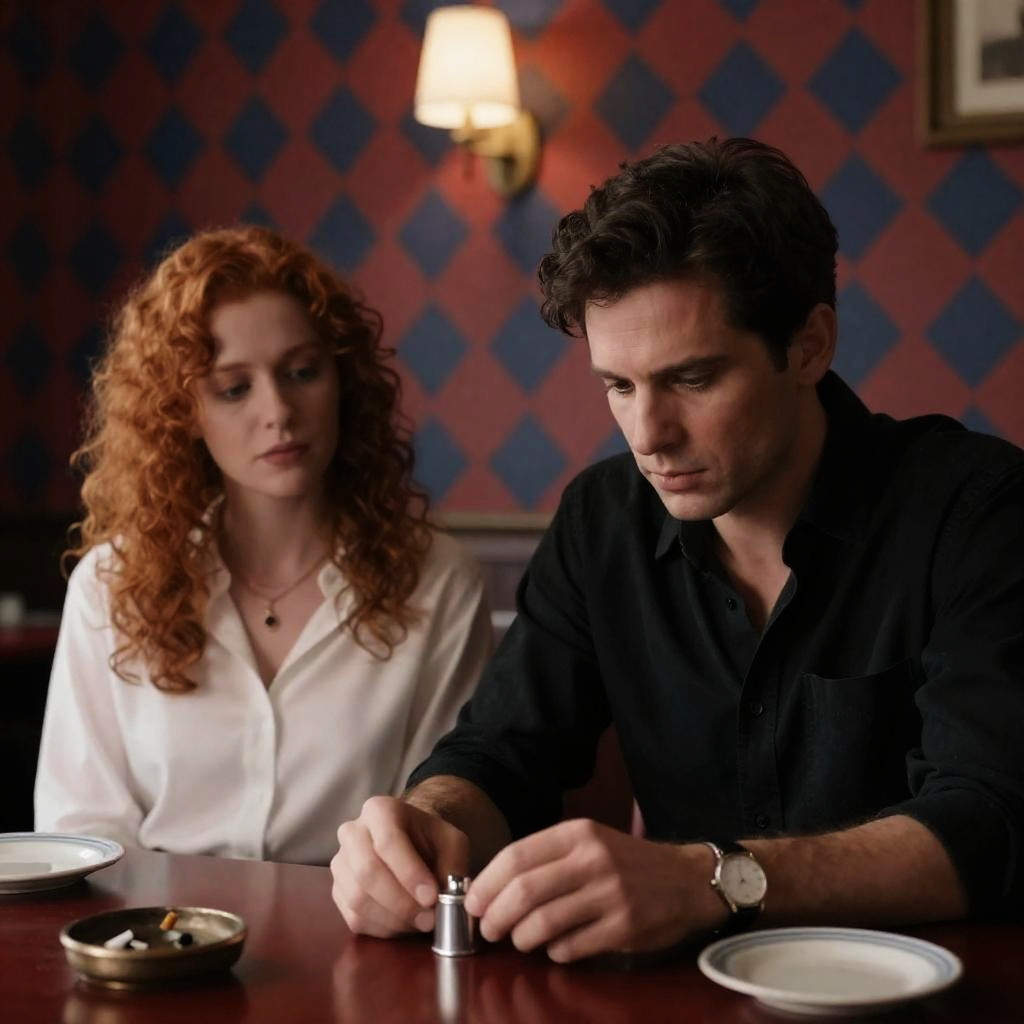 Photograph of a man with dark hair and a black shirt, focused on a small metal object on a table, while a woman with curly red hair and a white blouse looks at him. Red and blue diamond-patterned wallpaper, wall-mounted lamp in background. Man's wristwatch visible. Intense expression on man's face, neutral on woman's. Table has plates, cigarette holder, and other small items.