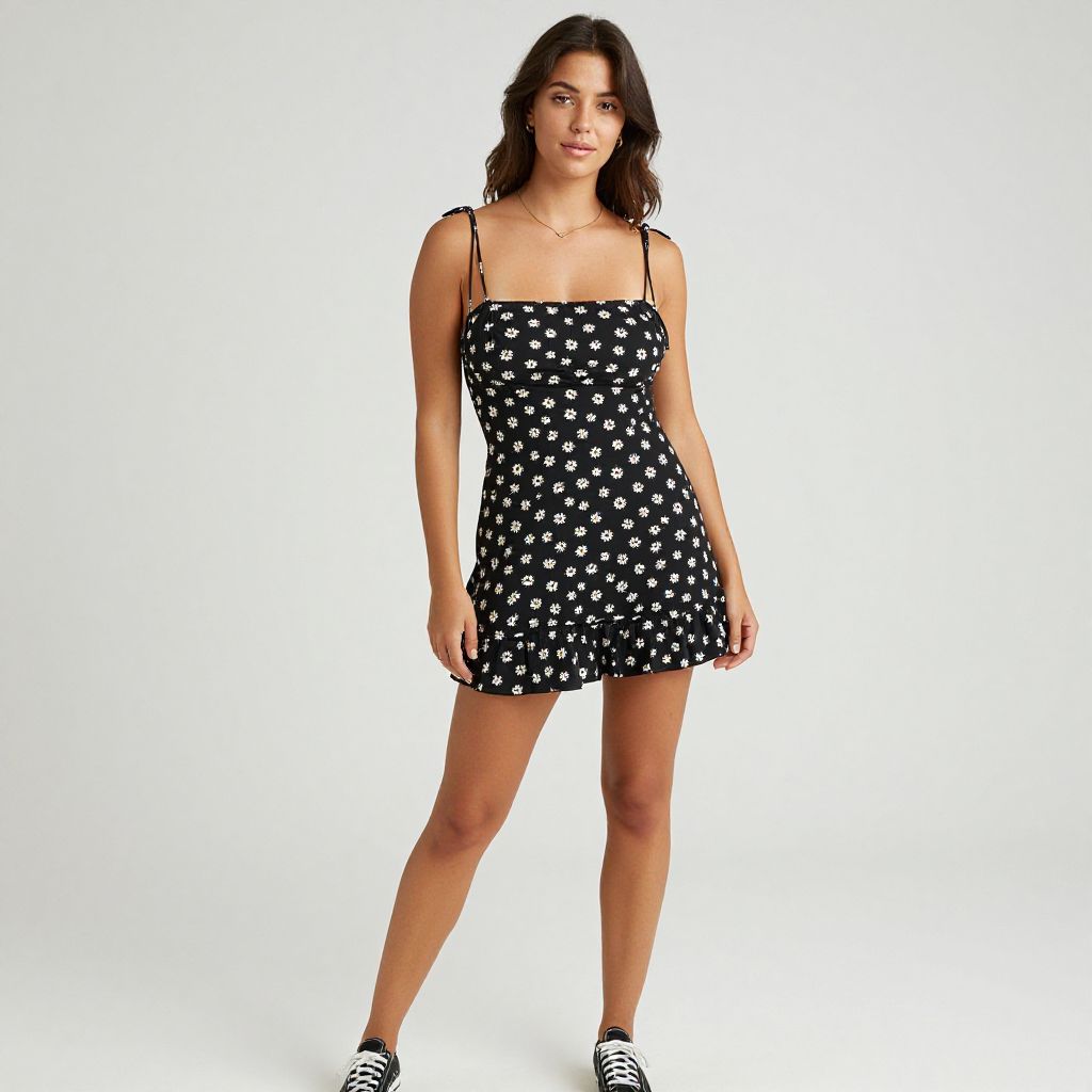 "Woman, casual summer style, black mini sundress with daisy print, square neckline, thin adjustable shoulder straps with tie details, ruffled hemline, low-top black sneakers, minimal jewelry, studio background with white backdrop.. Sexy. Pretty face and beаutiful eyes. Big breasts."