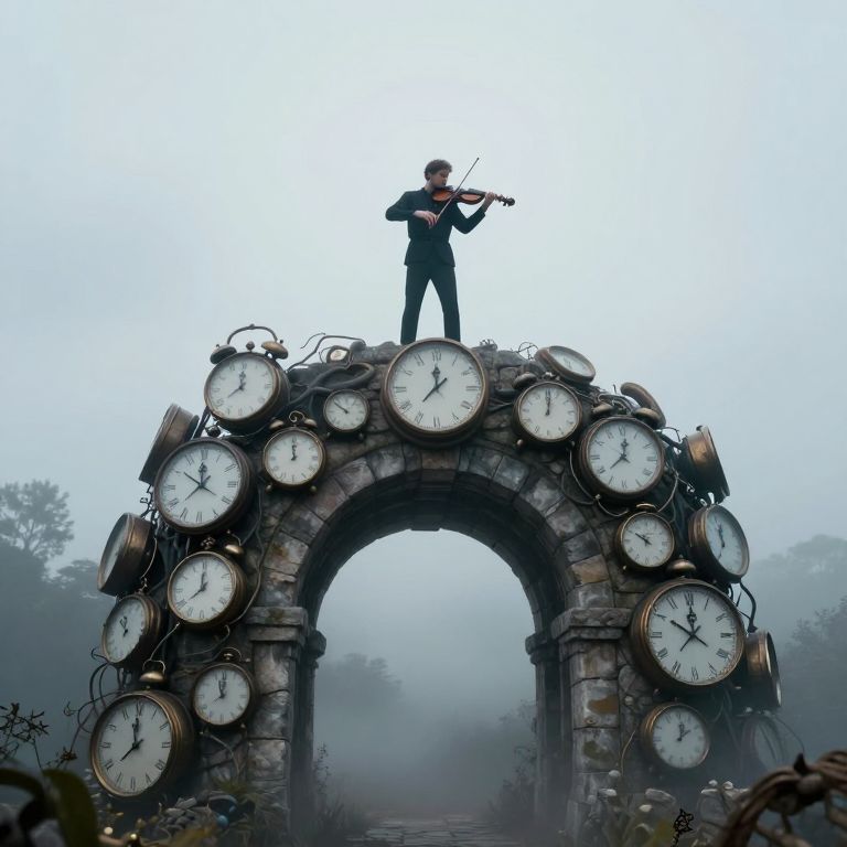 A solitary violinist stands atop a surreal stone archway adorned with an array of tangled clocks, their hands frozen in time, as he plays a haunting melody amidst a misty, ethereal landscape, evoking a dreamlike, cyberpunk-inspired atmosphere with a touch of digital artistry.