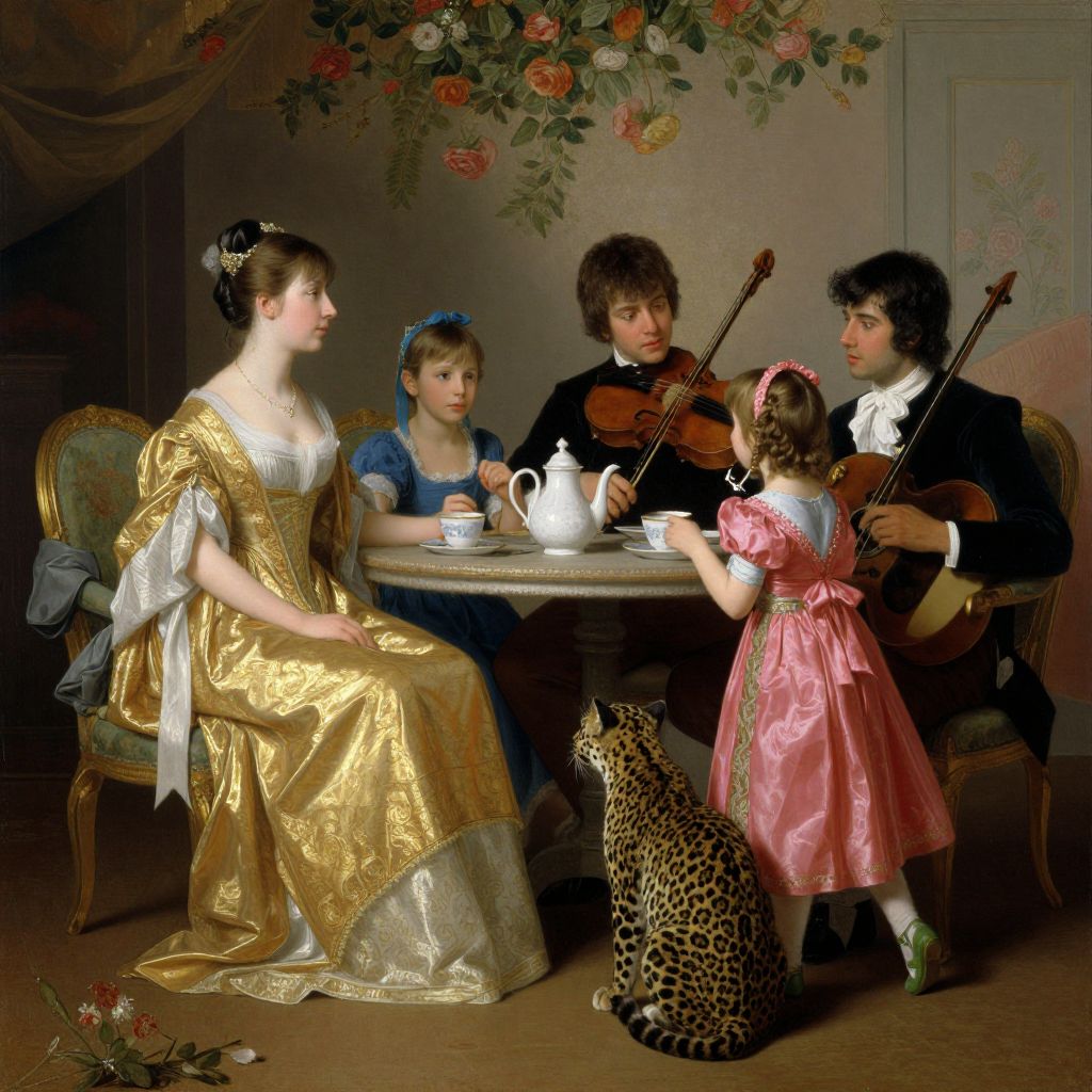 Photorealistic painting: Elegant woman in gold dress, children, and two musicians with violin and cello, leopard cat, floral wallpaper, tea set