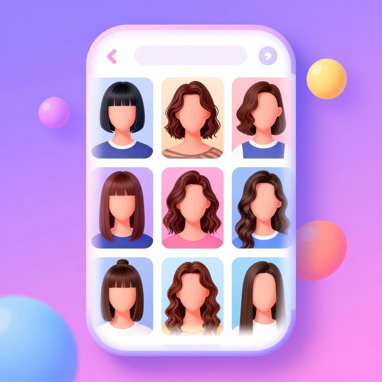 Hairstyle apps free concept, a digital artist creating a bubbly collage of haircuts in a mobile app environment, illustrated with vibrant colors and playful style, showcasing variety from short bob to long waves, user-friendly futuristic design