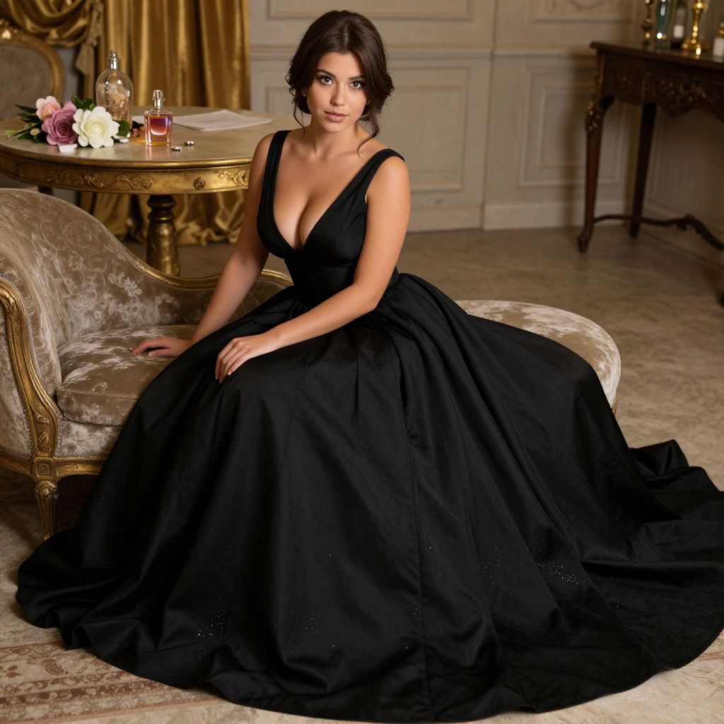 Photograph of a dark-haired woman with fair skin and a curvy figure, sitting on a beige, vintage-style chaise lounge. She is wearing a black, deep V-neck, floor-length evening gown with a voluminous skirt. The background includes an ornate wooden table with a floral arrangement, a glass bottle, and a candle, set against elegant, cream-colored walls and golden drapes. The carpet is patterned, and the lighting is soft, highlighting her elegant appearance and the luxurious setting.