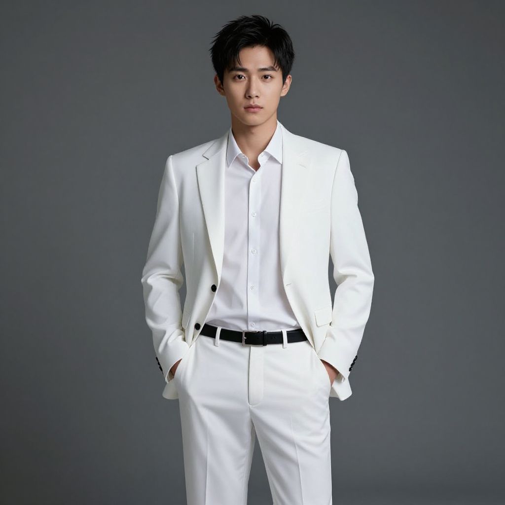 Eleven season white suit, 1boy, male focus, solo, belt, shirt, hands in pockets, pants, jacket, black hair, suit, realistic, formal, white jacket, looking at viewer, white pants, white shirt, collared shirt, standing