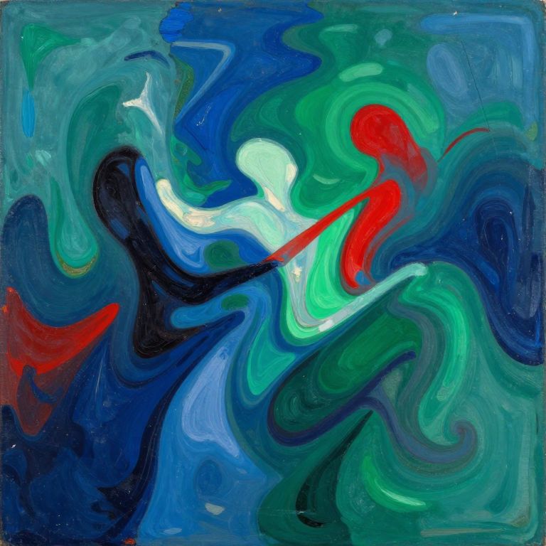 Capture the dynamic essence of Abstract Expressionism by creating an abstract composition viewed through an unconventional lens, akin to a 'bug's-eye view'. Swirling masses of vivid blues, greens, and reds collide and merge in a captivating dance, suggesting both harmony and chaos. This evokes an emotional spectrum ranging from serene tranquility to intense passion, with the underlying theme of balance and movement emphasized by the interplay between contrasting colors and shapes, challenging viewers' perceptions while sparking introspection.