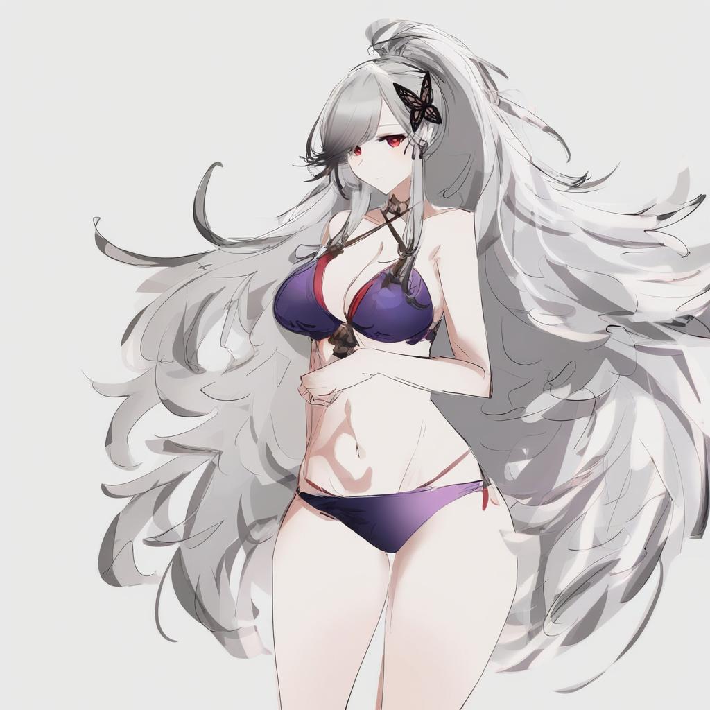 Digital anime-style illustration of a young woman with very long grey hair tied in a ponytail, featuring side locks and a butterfly hair ornament. She has red eyes and is wearing a purple bikini with black accents, revealing cleavage, bare shoulders, and her navel. The character stands against a plain light background, showcasing her slender figure and large breasts.