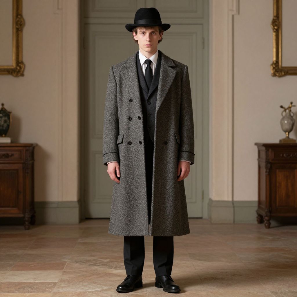 Jamie Costume, dressed in a long coat and a hat standing in a hall