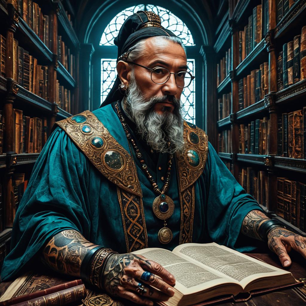 Closeup portrait of an ancient scholar with a long grey beard, round glasses, and mystic tattoos on his hands. He is wearing an elaborate dark teal robe with gold embroidery and a large pendant necklace. The scholar stands in a grand, old library filled with tall bookshelves and old books, under a decorative vaulted ceiling with stained glass. The scene is richly detailed with dramatic lighting and a fantasy art style.