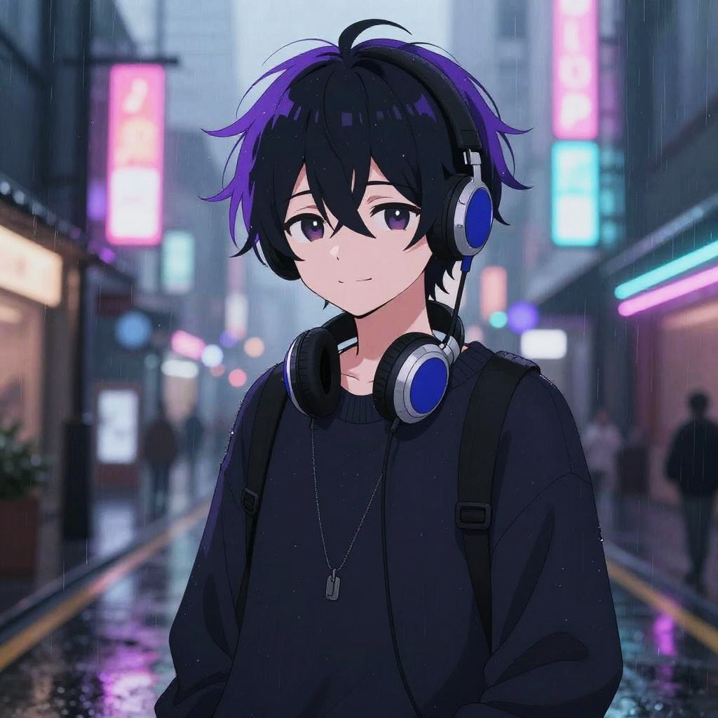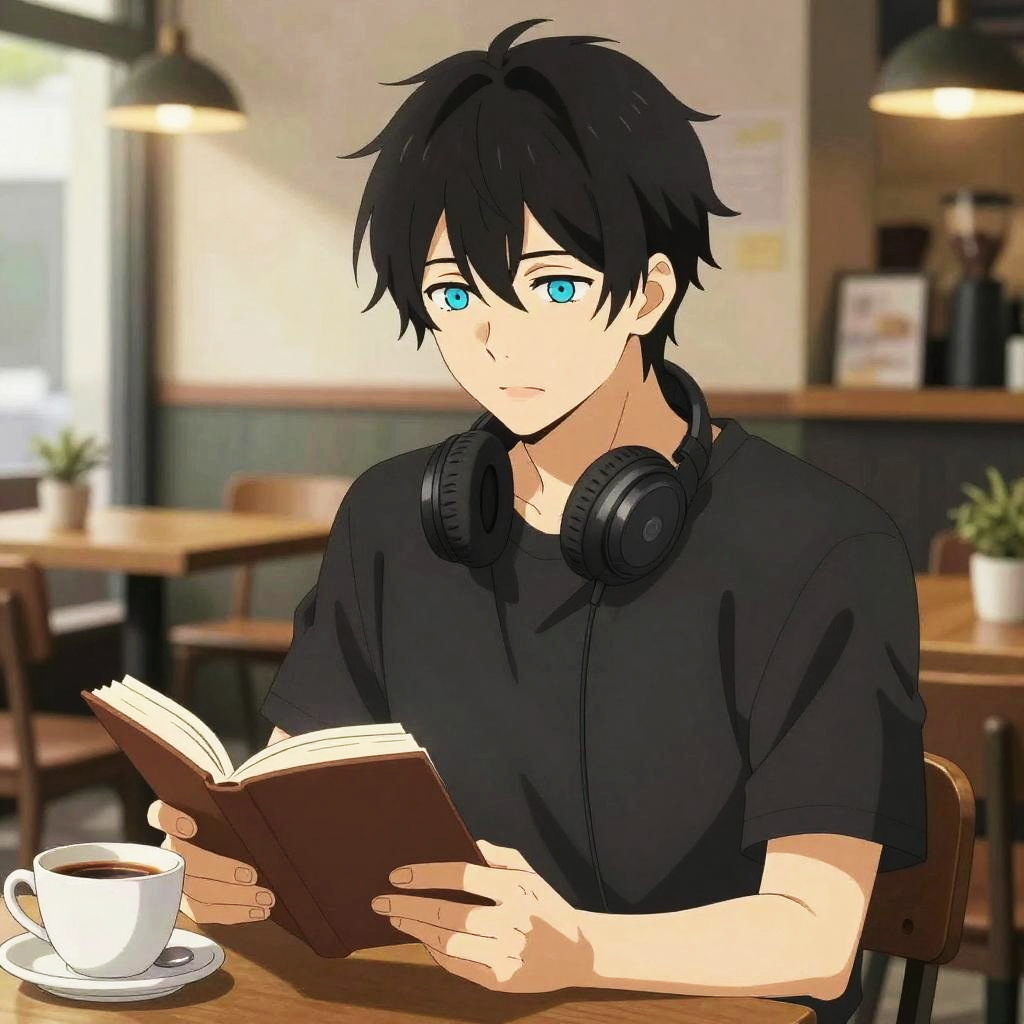 Anime-style drawing of a black-haired, blue-eyed young man with headphones around his neck, reading a book in a cozy café.