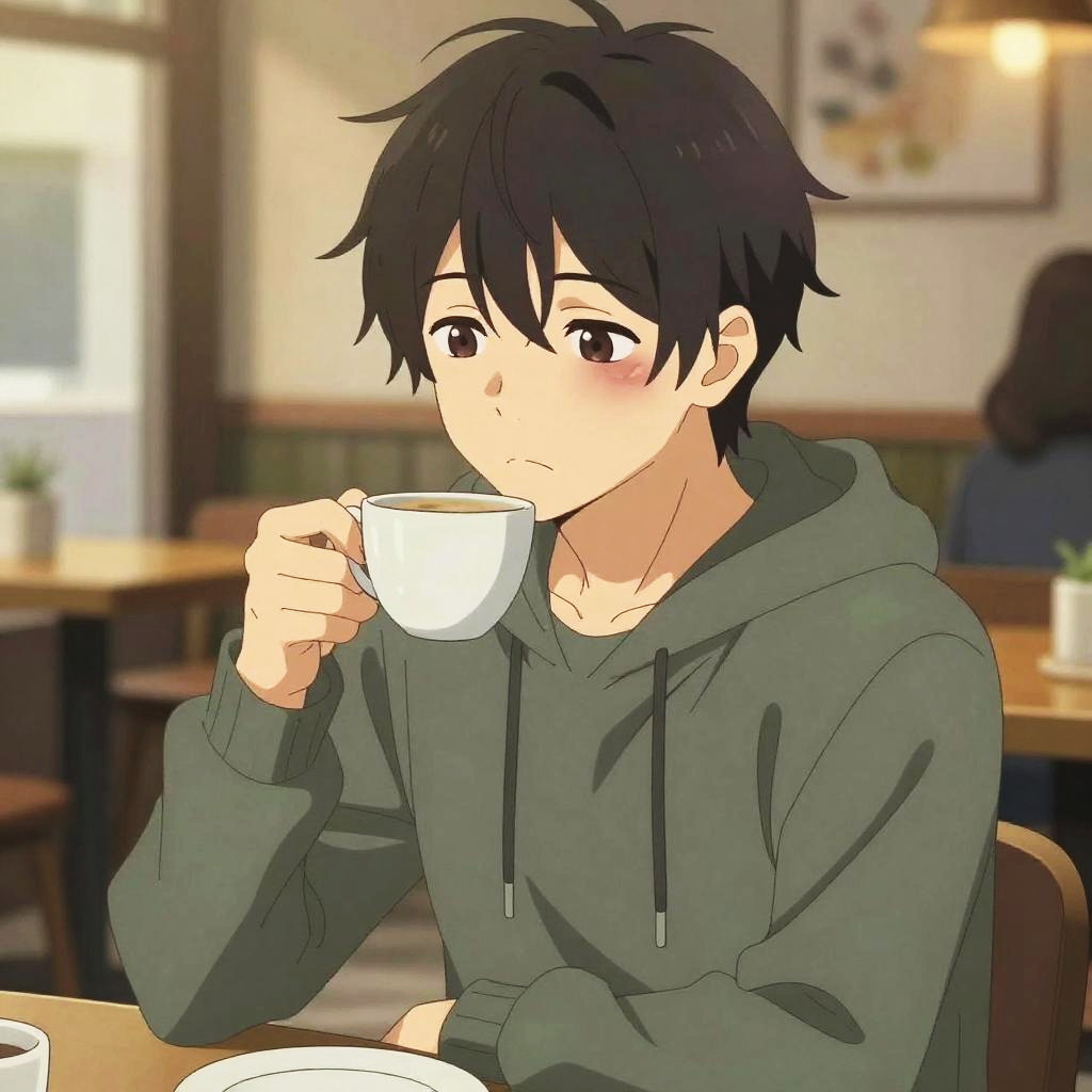 Anime man with black hair and piercing blue eyes, modern casual outfit with headphones around his neck, sitting in a cozy café, reading a book with a cup of coffee, warm color palette, cozy and inviting atmosphere, manga style with detailed backgrounds.