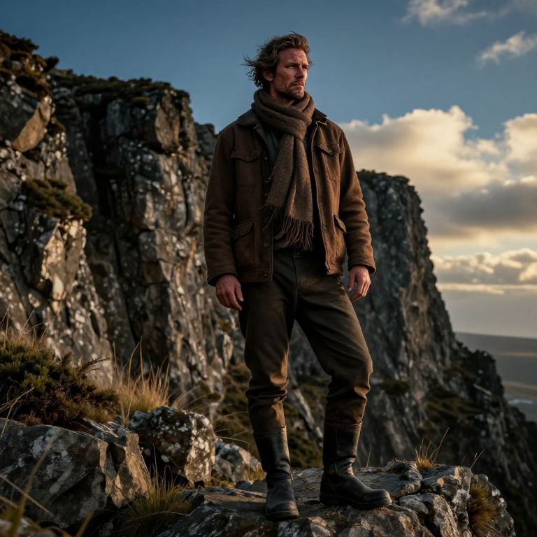 A tall, rugged male with weathered skin and a strong, defined jawline stands confidently in front of a dramatic rocky cliff. He wears a brown woolen jacket, a brown scarf wrapped tightly around his neck, and a pair of well-worn black boots on his feet. The wind gently blows through his hair, adding a sense of movement and wilderness. The cliff rises sharply in the background, covered in dense rock formations and wild vegetation, with a deep blue sky and soft golden sunlight filtering through the clouds. The scene captures a sense of solitude and strength, evoking a timeless, natural beauty.