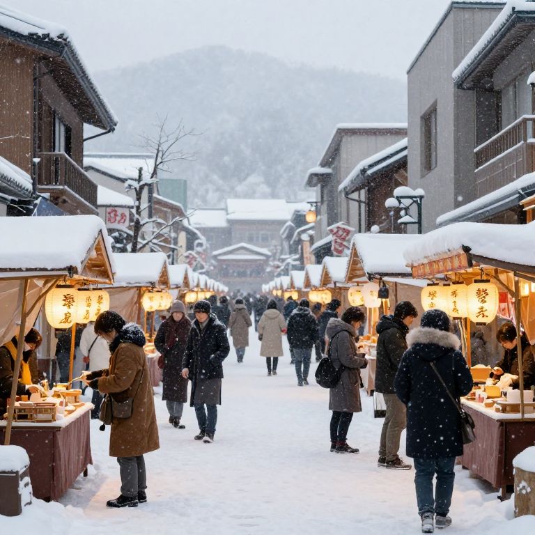 Yubari winter festival scene, snow-covered streets bustling with lanterns and festive stalls, locals in cozy clothing enjoying seasonal activities, soft snowfall adding a magical winter ambiance, intricate details and warm contrasts.